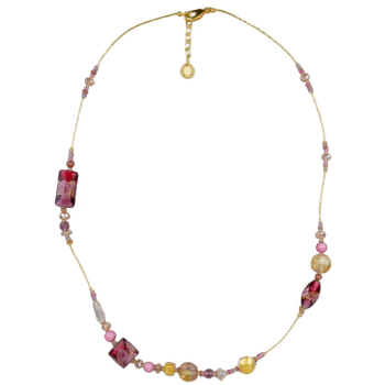 Изготовлено из муранского стекла розового, черного и золотого цвета. Длина колье 80см. Шпрингельный замок с удлинителем 4см. Гальваническое покрытие золото.