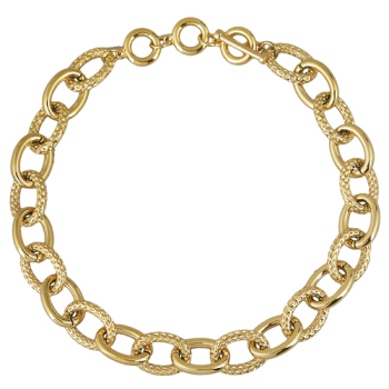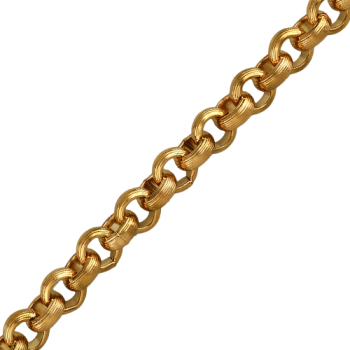 Изготовлено из ювелирного сплава на основе латуни с гальваническим покрытием античным золотом. Круглое рифленое плетение диаметром 9, 3мм. Длина 21см. Замок-карабин с удлинителем 2см.