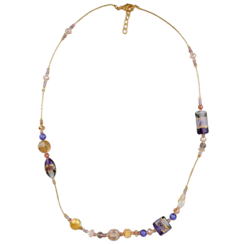 Изготовлено из муранского стекла фиолетового, серого и золотого цвета. Длина колье 80см. Шпрингельный замок с удлинителем 4см. Гальваническое покрытие золото.