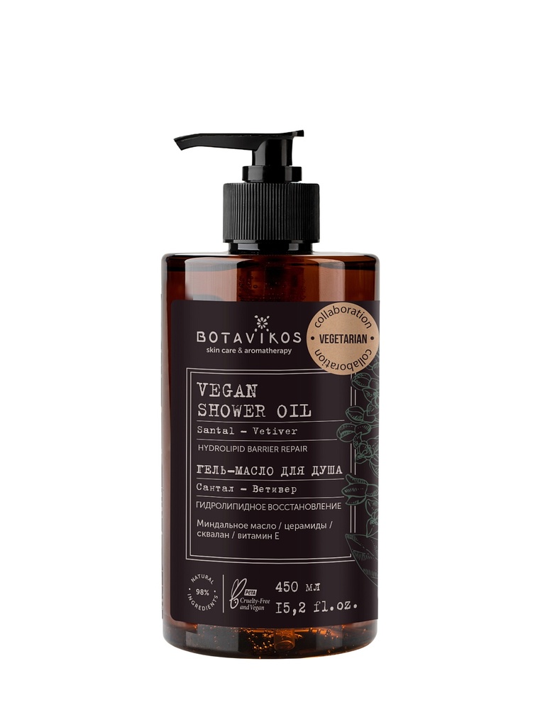Гель-масло для душа Сантал-Ветивер масло выпущено в коллаборации с Vegetarian и предназначено для интенсивного восстановления и бережного очищения кожи. Мягкая шелковистая текстура бережно очищает, пи... Показать описаниетает и укрепляет естественный барьер Уже после первого применения кожа — гладкая, увлажеённая и комфортная. ✔️ Укрепляет защитный барьер ✔️ Смягчает и предотвращает сухость и стянутость ✔️ Погружает в ароматерапевтический уход Тёплый глубокий аромат сандала и ветивера дарит ощущение спокойствия и гармонии. Наслаждайтесь божественным СПА у себя дома! Активные компоненты: Миндальное масло — глубоко питает и смягчает кожу, повышает эластичность и защищает от сухости и раздражения. Церамиды — предотвращают трансэпидермальную потерю влаги, поддерживают регенерацию кожи и защищают от внешних факторов. Сквалан — восстанавливает гидролипидную плёнку, уменьшает сухость и ощущение стянутости. Витамин E — мощный антиоксидант, придаёт коже упругость и сияние. Гель-масло для душа Сантал-Ветивер не содержит силиконов, парабенов, минеральных масел, компонентов животного происхождения, не тестируется на животных. No mineral oil, No silicone, No colorants, NO SLES, no PEG, no parabens, Animal-friendly.