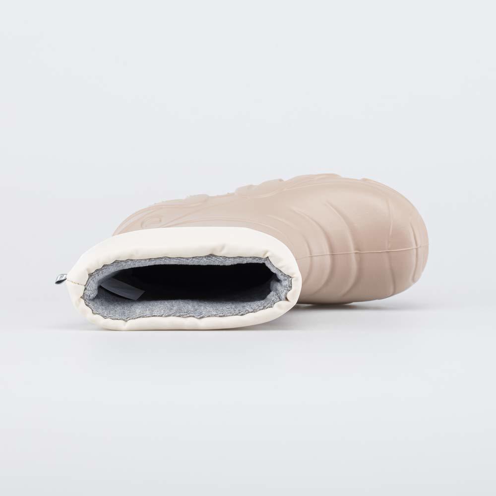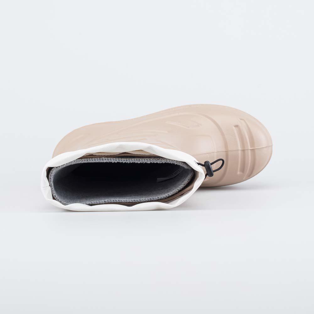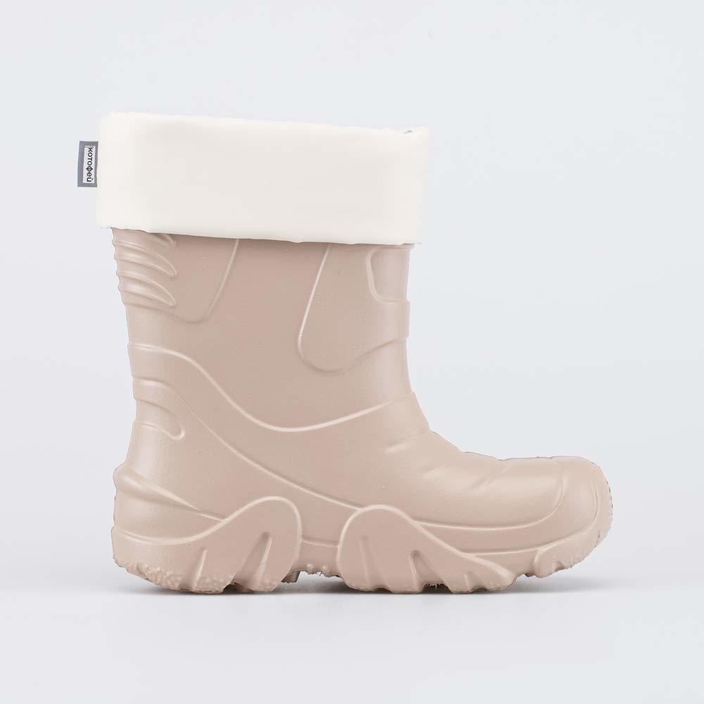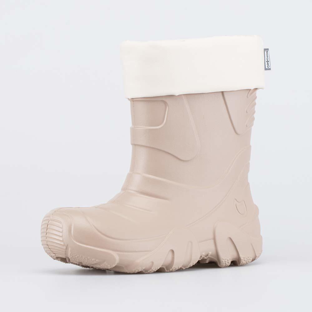 Описание Описание модели Детские утепленные сапоги из легкого, гибкого и амортизирующего материала ЭВА выполнены в трендовом бежевом цвете. Имеют двухслойный вкладной чулок и учитывают особенности дет... Показать описаниеской стопы. Вкладной чулок с пришитой войлочной стелькой состоит из нескольких слоев: 1 - внутренний из хлопкового флиса впитывает избыток влаги; 2 - утеплитель из полиэстера отвечает за теплоизоляцию. Укреплен внешним карманом из искусственной кожи, чтобы обеспечить дополнительную поддержку стопы. Чулок можно вынуть и просушить на батарее, а также при необходимости постирать в стиральной машине. Верхний манжет из нейлона затягивается на шнурок с фиксатором и защищает от попадания воды внутрь обуви. Обувь предназначена для детей дошкольного возраста, поэтому особое внимание уделено правильной конструкции: более плотный материал в районе пятки для придания необходимой жесткости и анатомическая форма следа. Сделано в России.