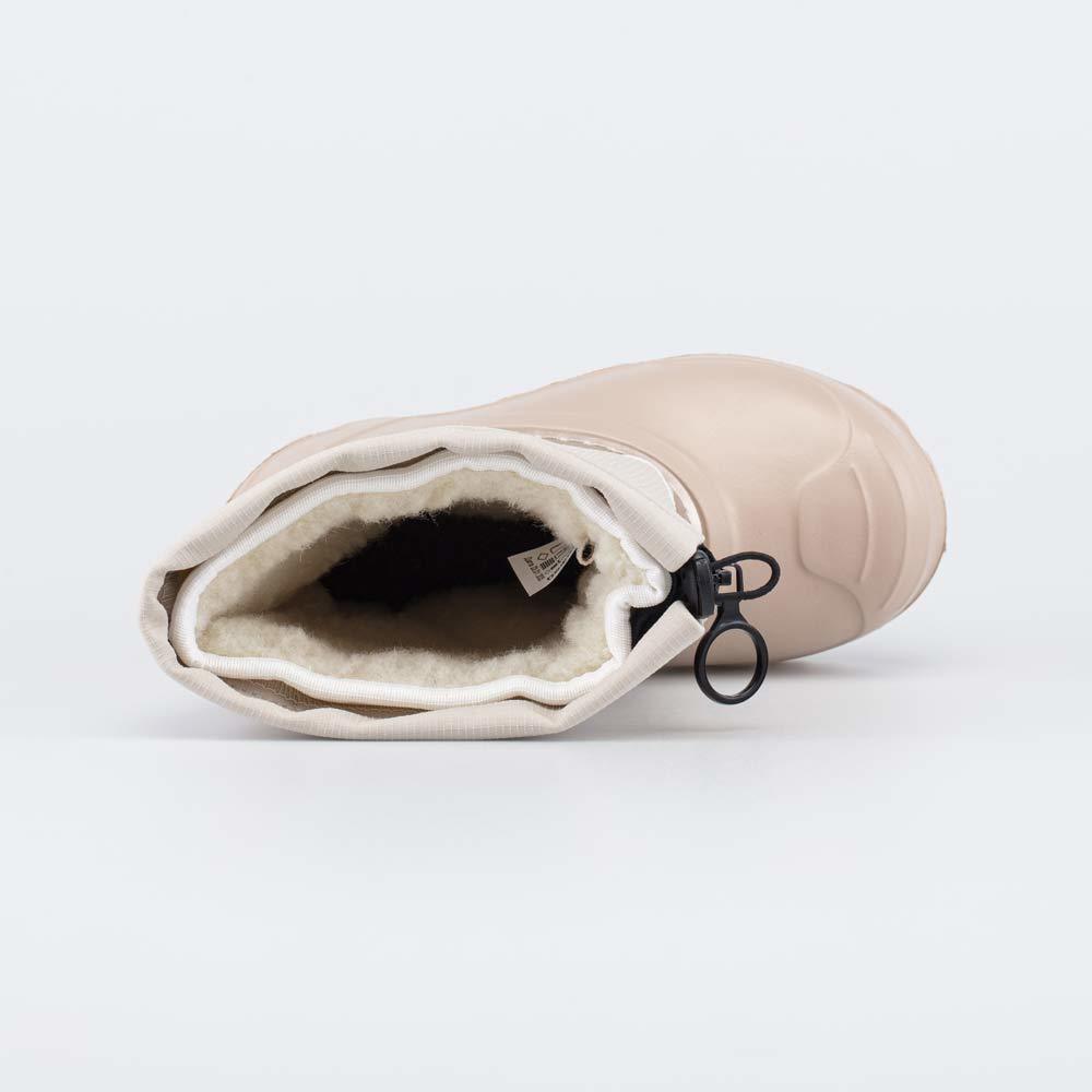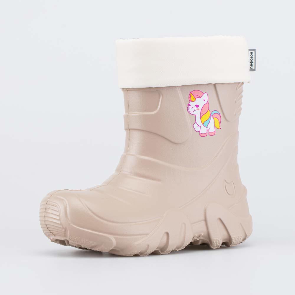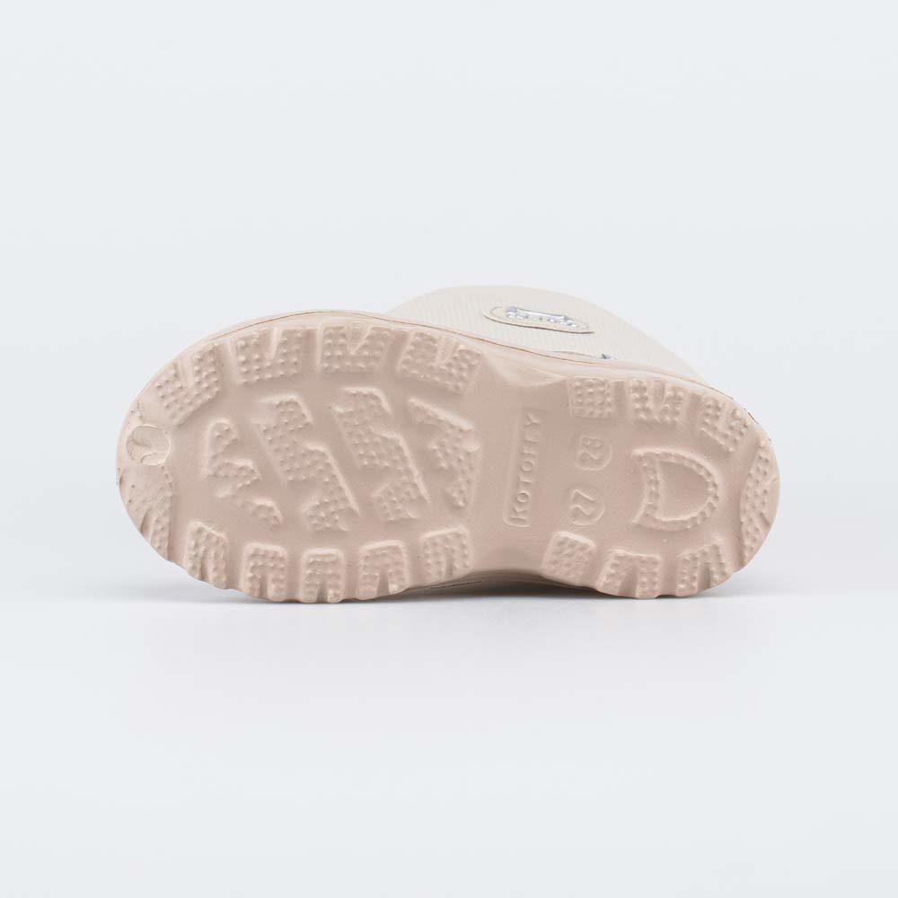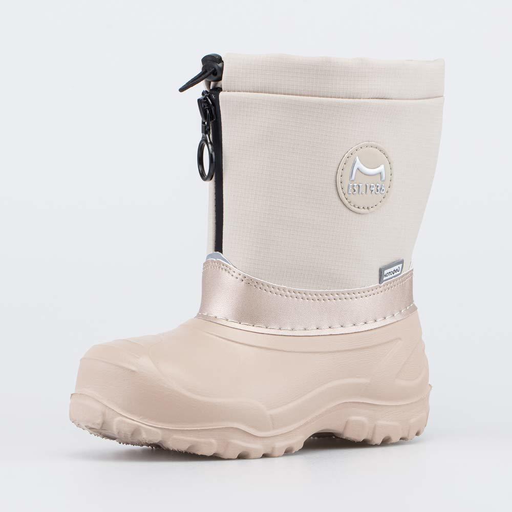 Описание Описание модели Детские утепленные сапоги из легкого, гибкого и амортизирующего материала ЭВА выполнены в трендовом бежевом цвете. Имеют двухслойный вкладной чулок и учитывают особенности дет... Показать описаниеской стопы. Вкладной чулок с пришитой войлочной стелькой состоит из нескольких слоев: 1 - внутренний из хлопкового флиса впитывает избыток влаги; 2 - утеплитель из полиэстера отвечает за теплоизоляцию. Укреплен внешним карманом из искусственной кожи, чтобы обеспечить дополнительную поддержку стопы. Чулок можно вынуть и просушить на батарее, а также при необходимости постирать в стиральной машине. Верхний манжет из нейлона затягивается на шнурок с фиксатором и защищает от попадания воды внутрь обуви. Обувь предназначена для детей дошкольного возраста, поэтому особое внимание уделено правильной конструкции: более плотный материал в районе пятки для придания необходимой жесткости и анатомическая форма следа. Сделано в России.