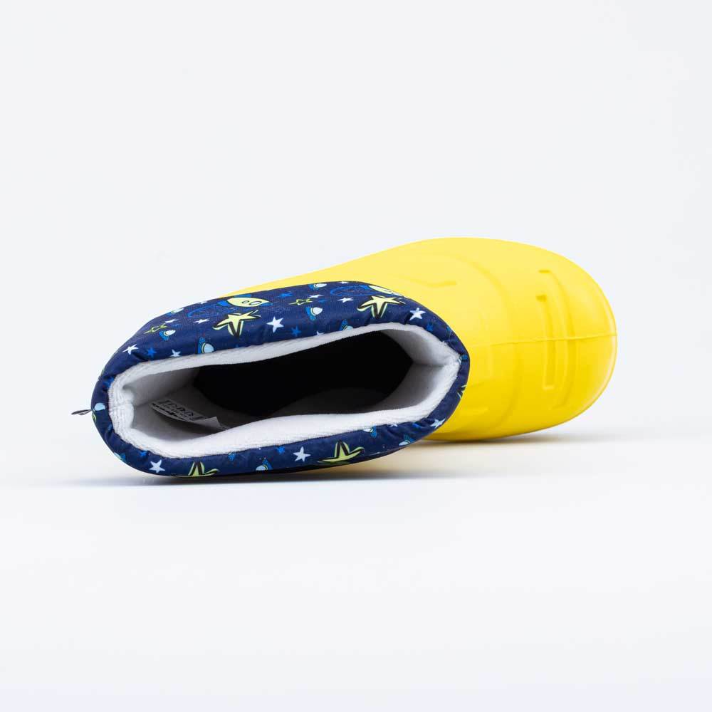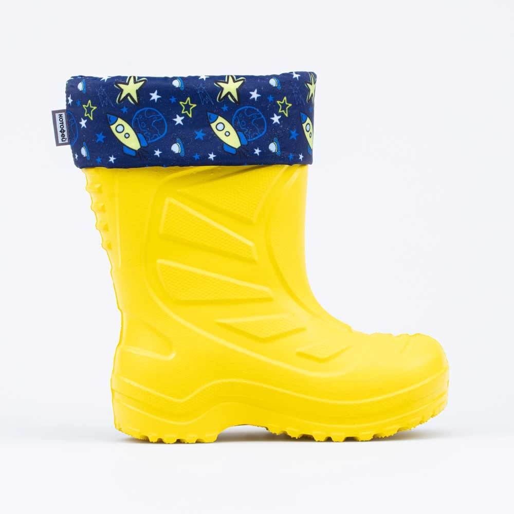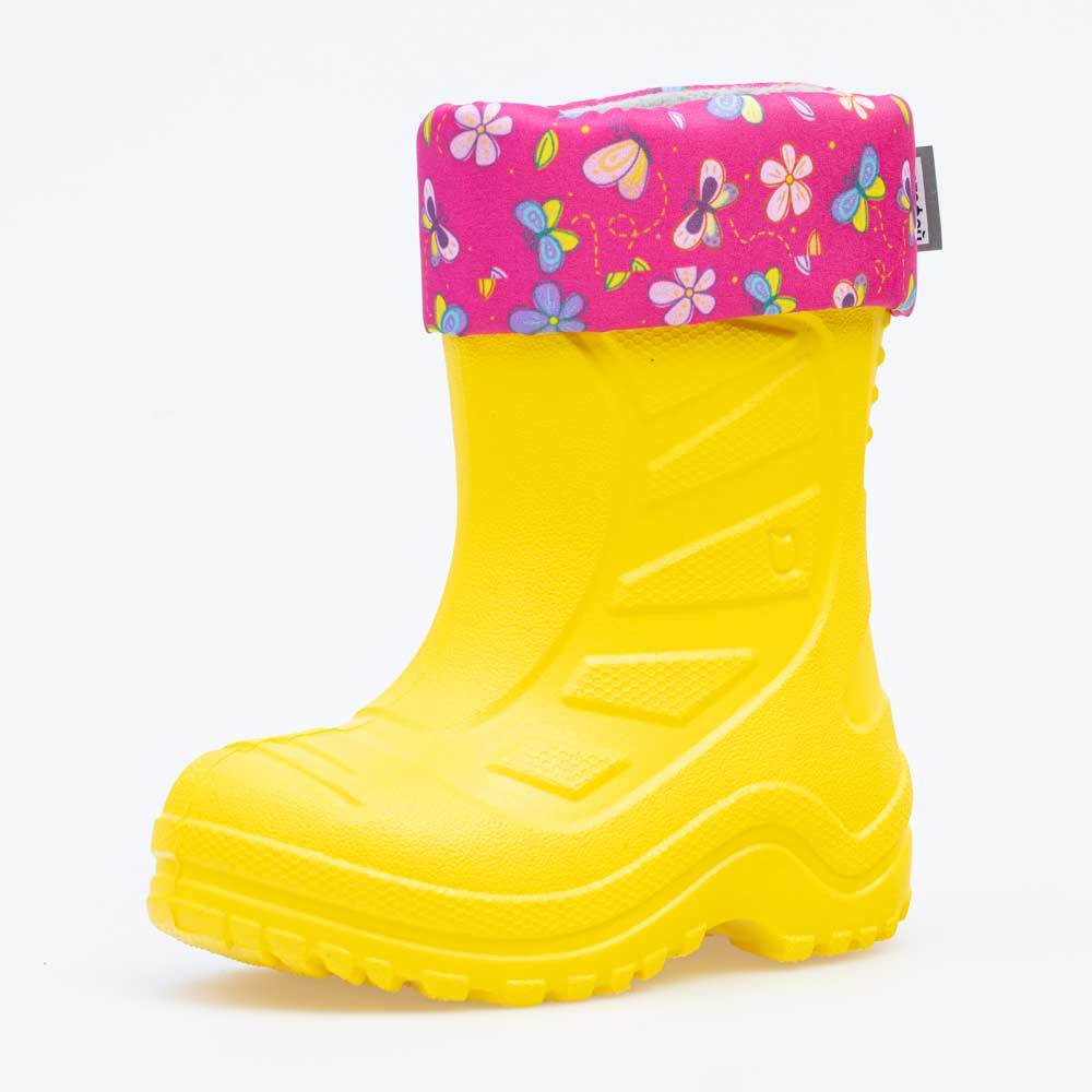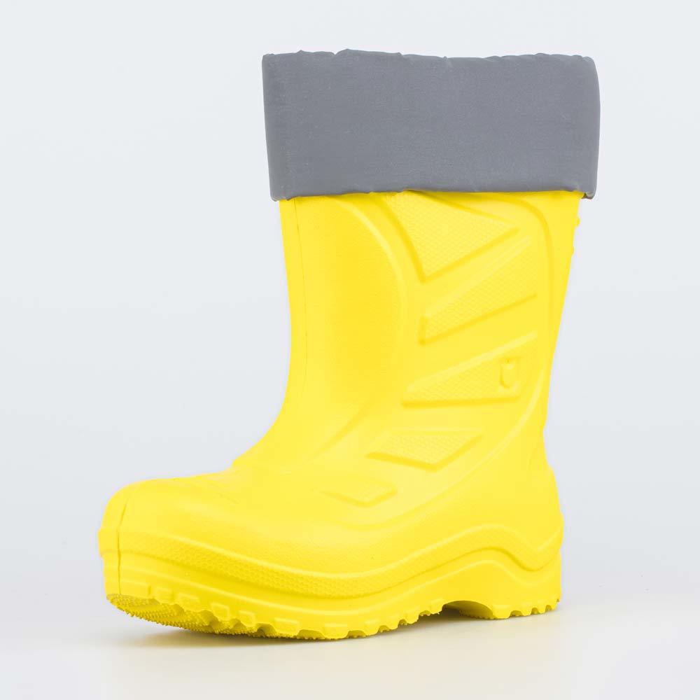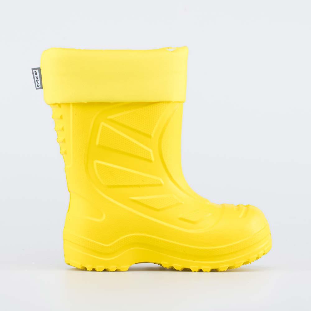 Описание Описание модели Утепленные сапоги из легкого, гибкого и амортизирующего материала ЭВА выполнены в позитивном желтом цвете. Имеют вкладной чулок и учитывают возрастные особенности стопы. Вклад... Показать описаниеной чулок с пришитой войлочной стелькой состоит из нескольких слоев: 1 - внутренний из хлопкового флиса впитывает избыток влаги; 2 - утеплитель из полиэстера отвечает за теплоизоляцию. Дополнительно в пяточной части имеется карман из искусственной кожи, который обеспечивает поддержку стопы и предохраняет материал от преждевременного истирания. Чулок можно вынуть и просушить на батарее, а также при необходимости постирать в стиральной машине. Отворот из плотного нейлона в сочетании с сапожками становится элементом дизайна. Обувь предназначена для детей школьного возраста, поэтому особое внимание уделено правильной конструкции: более плотный материал в районе пятки для придания необходимой жесткости и анатомическая форма следа. Сделано в России.