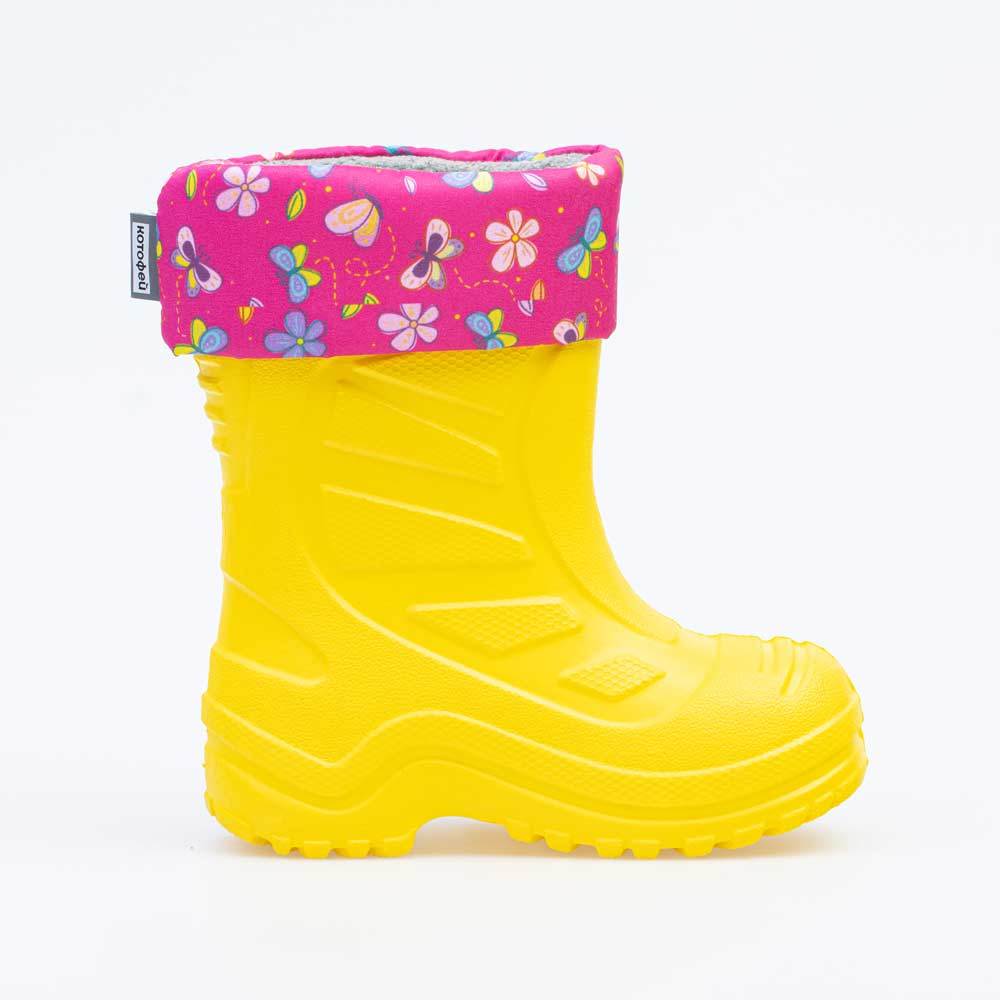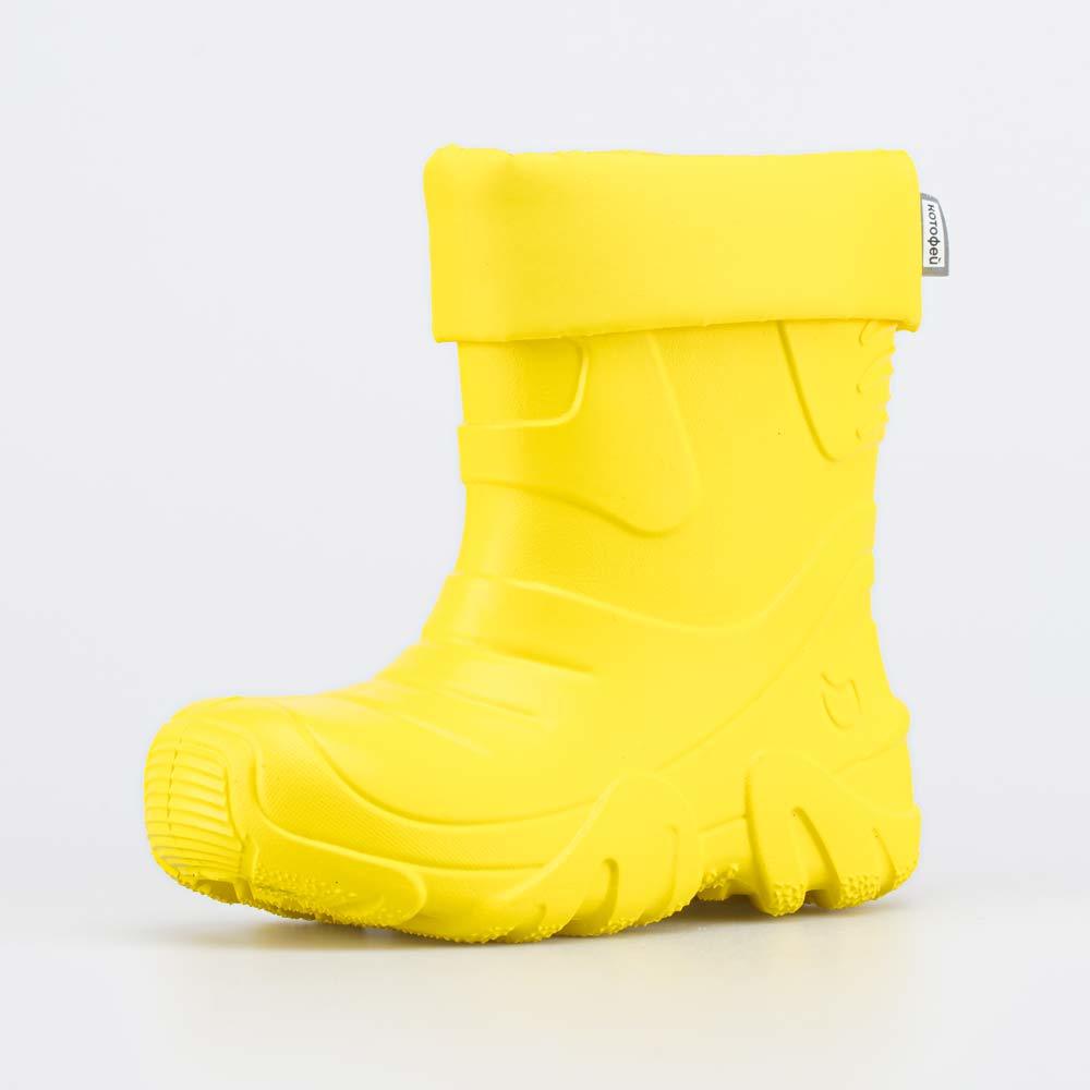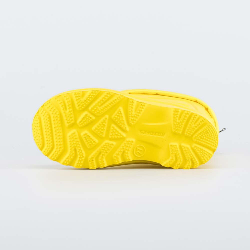 Описание Описание модели Детские утепленные сапоги из легкого, гибкого и амортизирующего материала ЭВА выполнены в позитивном желтом цвете. Имеют вкладной чулок и учитывают особенности детской стопы. ... Показать описаниеВкладной чулок с пришитой войлочной стелькой состоит из нескольких слоев: 1 - внутренний из хлопкового флиса впитывает избыток влаги; 2 - утеплитель из полиэстера отвечает за теплоизоляцию. Дополнительно в пяточной части имеется карман из искусственной кожи, который обеспечивает поддержку стопы и предохраняет материал от преждевременного истирания. Чулок можно вынуть и просушить на батарее, а также при необходимости постирать в стиральной машине. Отворот из плотного нейлона в сочетании с сапожками становится элементом дизайна. Обувь предназначена для детей дошкольного возраста, поэтому особое внимание уделено правильной конструкции: более плотный материал в районе пятки для придания необходимой жесткости и анатомическая форма следа. Сделано в России.