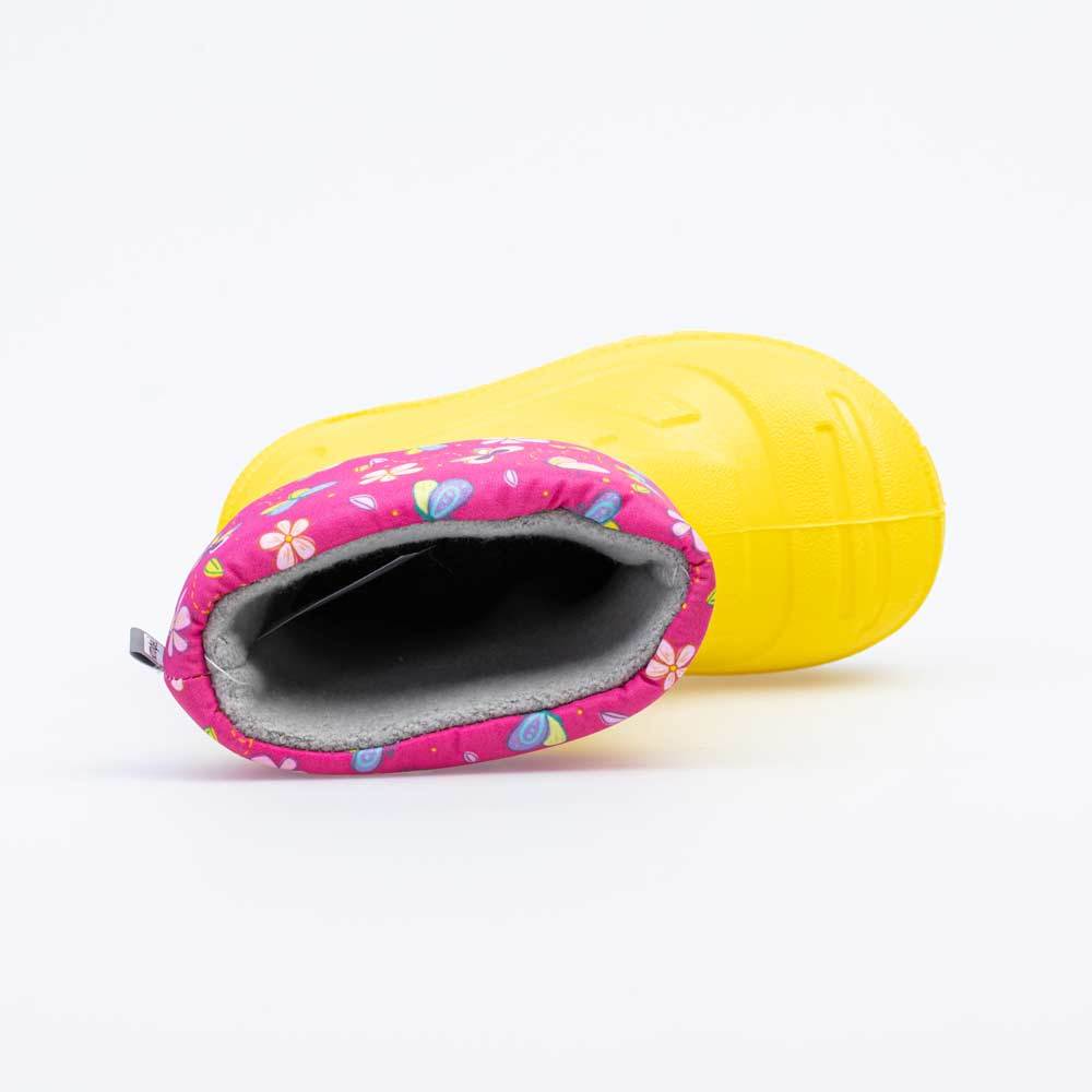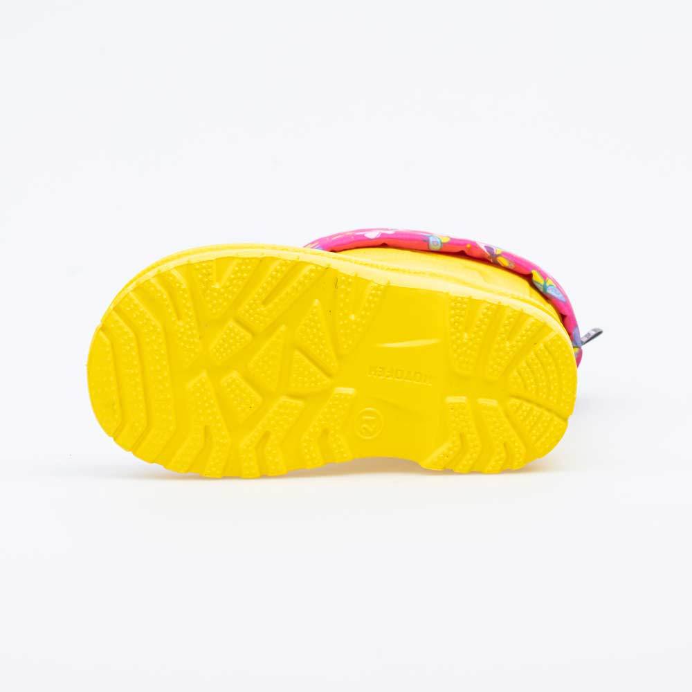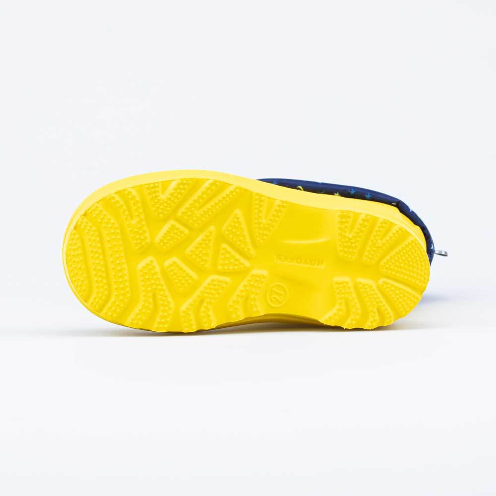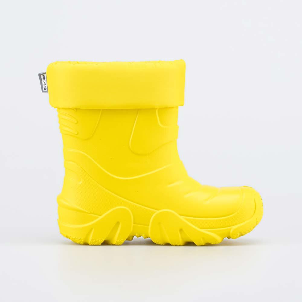 Описание Описание модели Детские утепленные сапоги из легкого, гибкого и амортизирующего материала ЭВА выполнены в позитивном желтом цвете. Имеют вкладной чулок и учитывают особенности детской стопы. ... Показать описаниеВкладной чулок с пришитой войлочной стелькой состоит из нескольких слоев: 1 - внутренний из хлопкового флиса впитывает избыток влаги; 2 - утеплитель из полиэстера отвечает за теплоизоляцию. Дополнительно в пяточной части имеется карман из искусственной кожи, который обеспечивает поддержку стопы и предохраняет материал от преждевременного истирания. Чулок можно вынуть и просушить на батарее, а также при необходимости постирать в стиральной машине. Отворот из плотного нейлона в сочетании с сапожками становится элементом дизайна. Обувь предназначена для детей дошкольного возраста, поэтому особое внимание уделено правильной конструкции: более плотный материал в районе пятки для придания необходимой жесткости и анатомическая форма следа. Сделано в России.