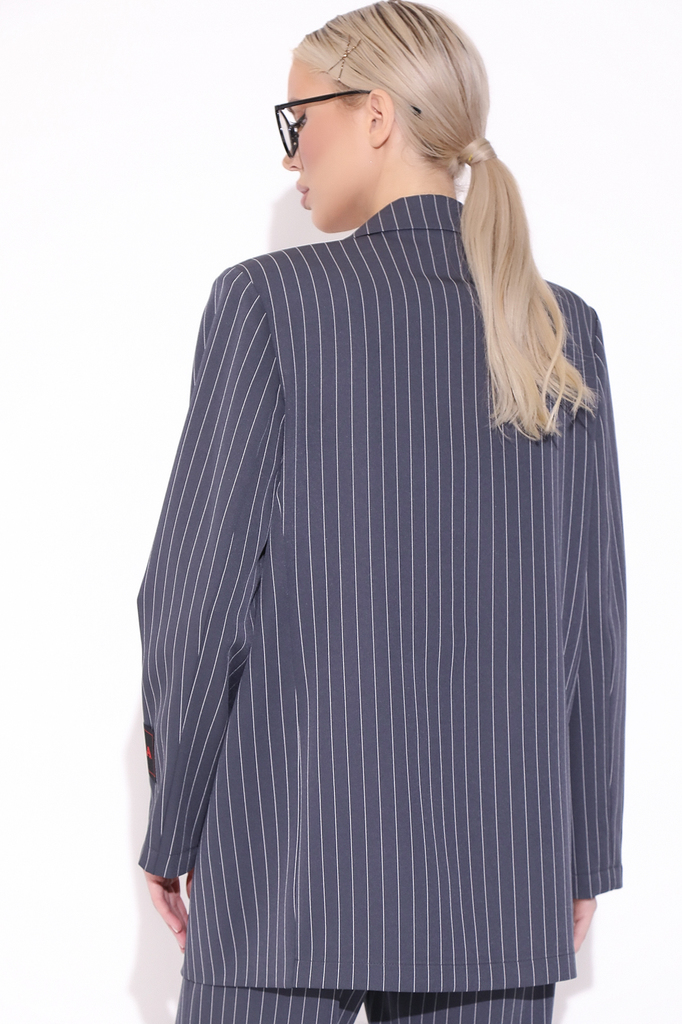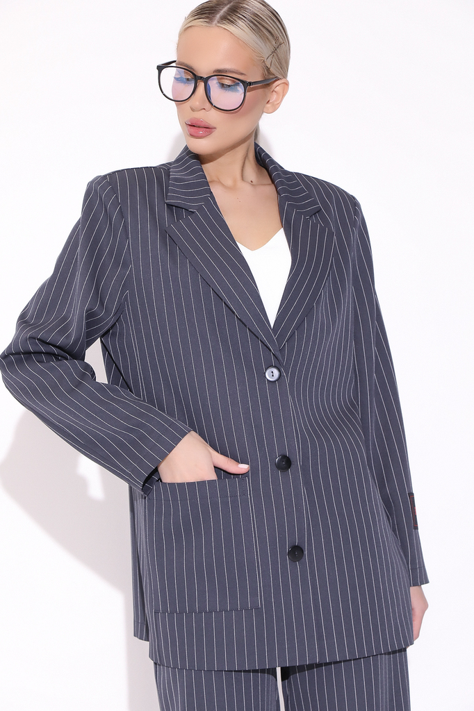 Состав: П/э 80%; вискоза 10%; эластан 10% Описание Пиджак- это базовая вещь в гардеробе каждой женщины. Этот свободный и идеальный пиджак может подчеркнуть Вашу индивидуальность и стиль. Он смотрится ... Показать описаниеэффектно и модно. пиджак модели oversize – одно из популярных направлений. Материал: костюмный Принт: полоска Вид застежки: пуговица Силуэт: свободный Карманы: есть Подкладка: отсутствует Длина по спинке от верхней точки плеча: 44 – 52 р – 75см, рукав 60 см Размер изделия на модели: 44 Рост модели: 172 см Параметры модели: 88-63-96