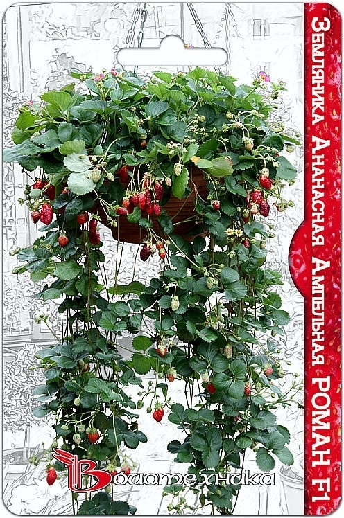 Настоящая ампельная форма ананасной гибридной земляники. Схема выращивания земляники из семян: Посев в первой декаде февраля, для получения взрослого плодоносящего растения в июле. Посев производится ... Показать описаниев емкость со светопроницаемой крышкой для защиты семян и грунта от пересыхания. Грунт мелкодисперсный, с малым содержанием питательных веществ, увлажненный. Семена равномерно распределяются по поверхности грунта, не присыпаются. Прорастание 8-10 дней при температуре + 23-25°С и дополнительном освещении (в феврале-марте 40-60 Вт/м2) Полив лучше проводить опрыскиванием. Емкость регулярно проветривается, крышка убирается полностью только после появления дружных всходов. Дальнейшее культивирование осуществляется при температуре + 18-20°С. Пикировка проводится в фазе двух настоящих листочков, через 25-30 дней после появления всходов в горшочки диаметром 6 см. За время выращивания в рассадном горшочке растение рекомендуется подкормить два раза жидким полным минеральным удобрением с микроэлементами. В подвесные кашпо, диаметром 40-45 см высаживаются 2-3 растения в возрасте 60-65 дней. Осенью растение подрезается и высаживается в грунт, прикрывается опавшей листвой. В весенний период после просыпания корневищных почек снова высаживается в подвесное кашпо.