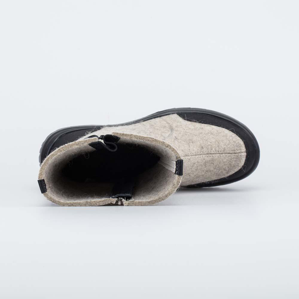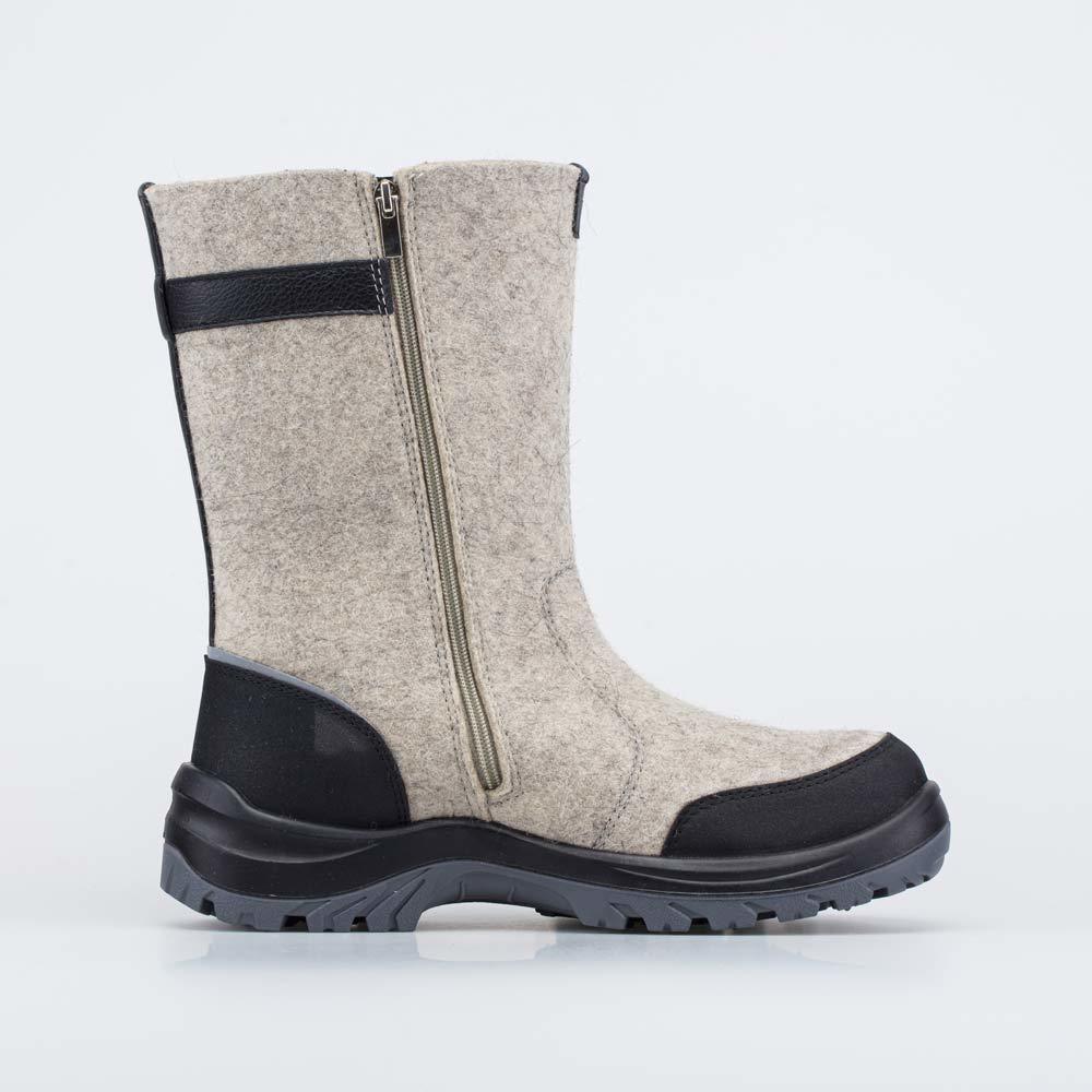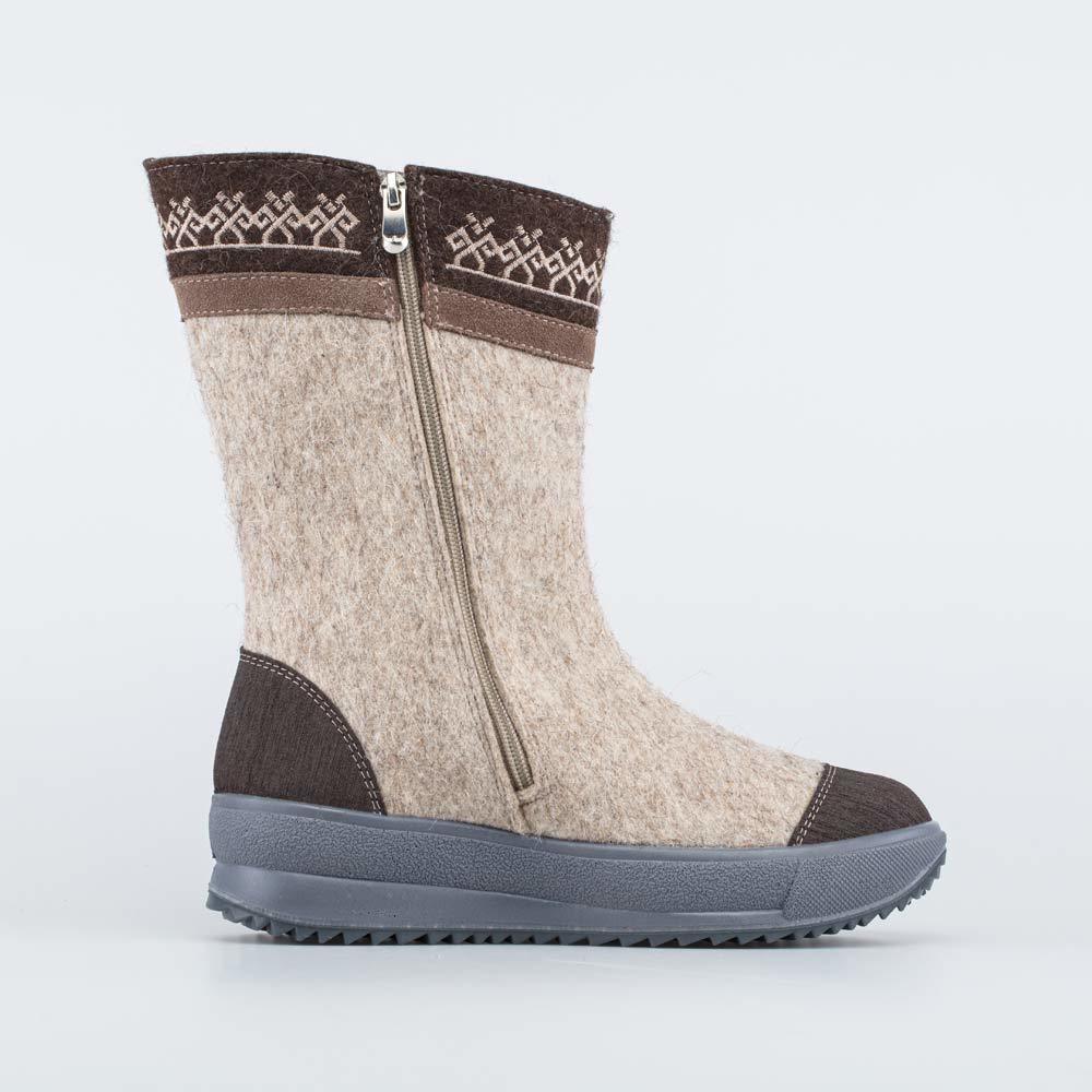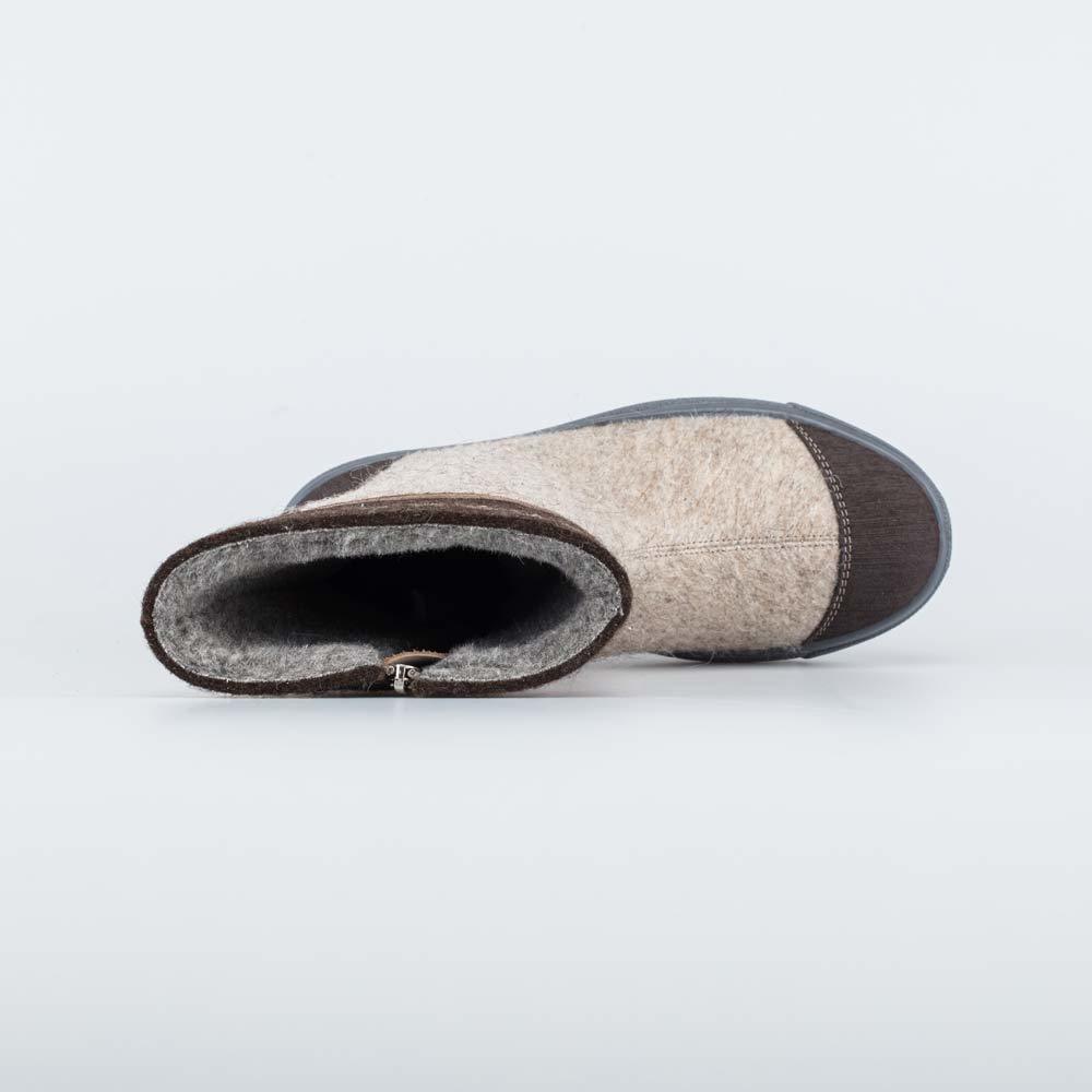 Описание Описание модели Уютные короткие валенки, стилизованные под войлочные ботинки, гармонично дополняют зимний гардероб современной женщины. Бежевый цвет войлока эффектно подчеркнут более светлым ... Показать описаниеоттенком меха барашек на манжете. Войлок плотный, с водоотталкивающими свойствами. Он надежно сохраняет тепло, дышит и создаёт приятный микроклимат вокруг стопы. Эти теплые валенки имеют подкладку из шерстяного меха, которая обеспечивает дополнительную теплоизоляцию и комфорт даже в сильные морозы. Войлочная стелька снабжена петелькой, чтобы легко вынимать ее для проветривания. Шнурки подчеркивают концепцию ботинок из войлока, а застежка-молния дает возможность быстро обуваться и разуваться. Модная плоская подошва из облегченной резины хорошо амортизирует, обеспечивает высокую устойчивость зимней обуви и органично дополняет цветовую гамму. Модель анатомически правильная: обеспечивает комфортную поддержку стоп в течение всего дня. Сделано в России, ТМ Гуслицкие.