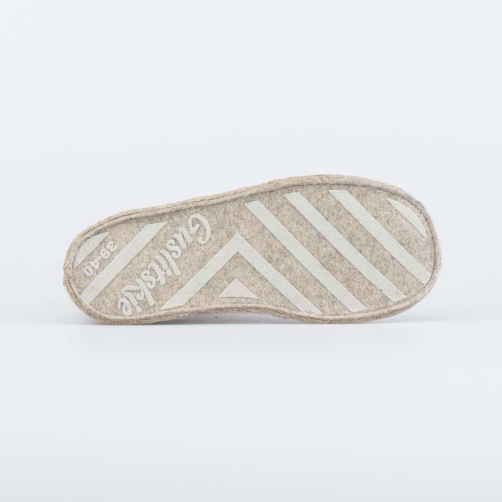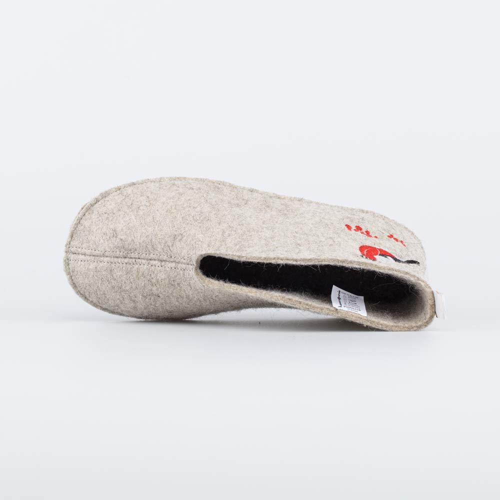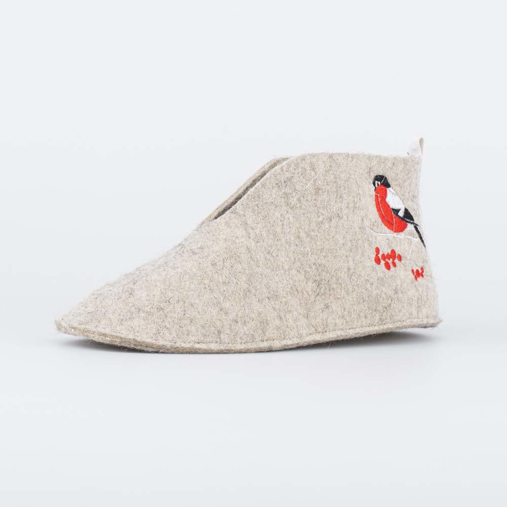 Описание Описание модели Закрытые тапочки-чуни для женщин, выполнены из войлока светло-серого цвета и украшены вышивкой в виде снегиря. 100% натуральный войлок создает уют, обладает массажным действие... Показать описанием и дарит сухое тепло. Полиуретановое напыление на подошве, чтобы тапочки не скользили и дольше носились. Внутри есть дополнительная стелька из войлока. Можно носить с носками или на босу ногу. Подходят для дома, а также для бани или сауны. Допустима ручная стирка с мягкими моющими средствами. Сделано в России, г. ТМ Гуслицкие.