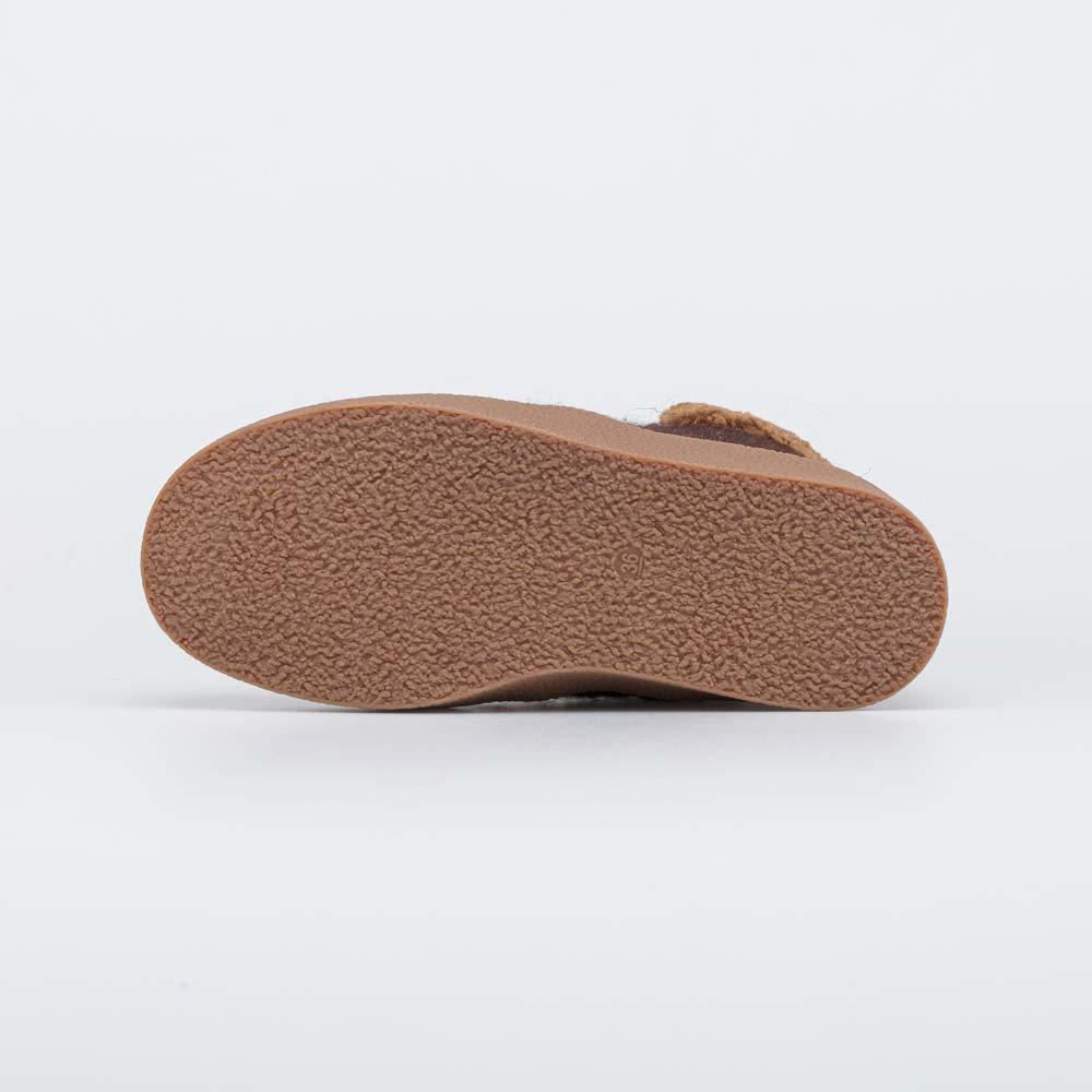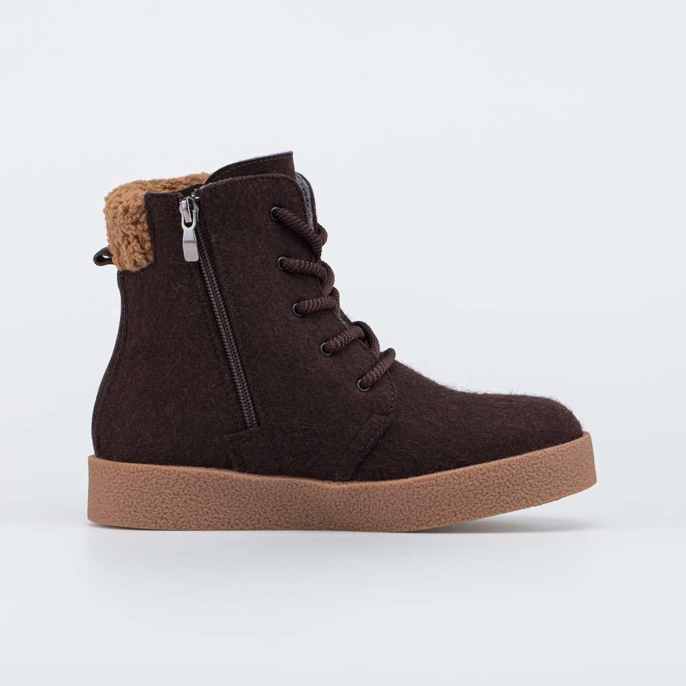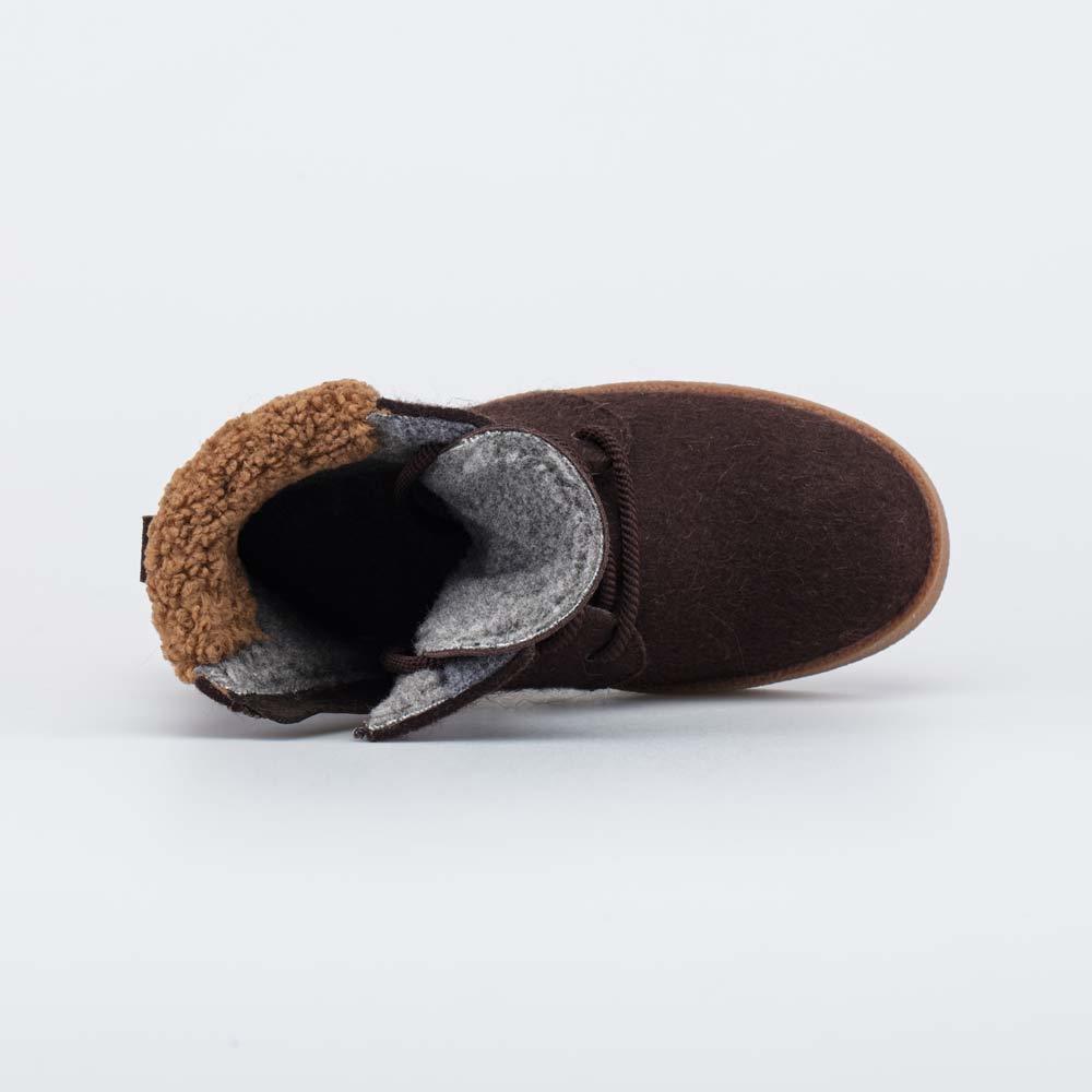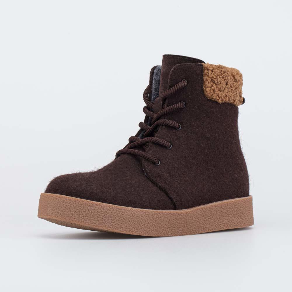 Описание Описание модели Уютные короткие валенки, стилизованные под войлочные ботинки, гармонично дополняют зимний гардероб современной женщины. Глубокий коричневый цвет войлока эффектно подчеркнут бе... Показать описаниежевым оттенком меха барашек на манжете. Войлок плотный, с водоотталкивающими свойствами. Он надежно сохраняет тепло, дышит и создаёт приятный микроклимат вокруг стопы. Эти теплые валенки имеют подкладку из шерстяного меха, которая обеспечивает дополнительную теплоизоляцию и комфорт даже в сильные морозы. Войлочная стелька снабжена петелькой, чтобы легко вынимать ее для проветривания. Шнурки подчеркивают концепцию ботинок из войлока, а застежка-молния дает возможность быстро обуваться и разуваться. Модная плоская подошва из облегченной резины хорошо амортизирует, обеспечивает высокую устойчивость зимней обуви и органично дополняет цветовую гамму. Модель анатомически правильная: обеспечивает комфортную поддержку стоп в течение всего дня. Сделано в России, ТМ Гуслицкие.