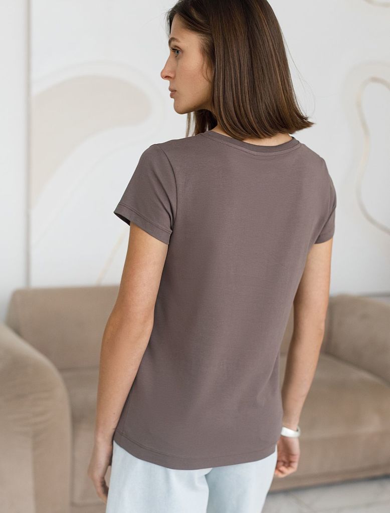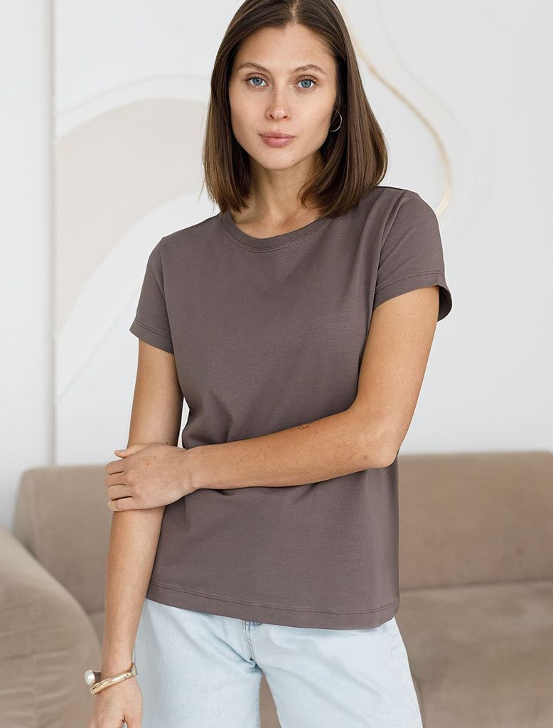 Состав: 92%Хлопок 8%ПУ Плотность: 170 Г/м2 Стильная и модная женская футболка кофейного цвета станет отличным дополнением к вашему гардеробу. Футболка плотностью 170 Г/м2 изготовлена из премиального х... Показать описаниелопка с добавлением эластана. Добавление эластана в состав изделия способствует формоустойчивости. Эта классическая футболка подходит для создания кэжуал образа на каждый день и идеально подойдет для работы. Модель не мнется, что делает ее практичным вариантом для активных женщин, которые ценят стиль и удобство. Благодаря однотонной расцветке эта футболка легко комбинируется с различными элементами гардероба. Она станет универсальным решением для тех, кто предпочитает комфортный стиль casual. Повседневная футболка подчеркнет вашу индивидуальность и позволит вам выглядеть привлекательно в любой ситуации. Легкость в уходе и высокая износостойкость делают ее незаменимой вещью в вашем гардеробе. Одевайте эту модель как на работу, так и на встречу с друзьями — она всегда будет уместна! Стильная и практичная модель с простым кроем и лаконичным дизайном - идеальный вариант для тех, кто ценит качество, минимализм и классический стиль в одежде.