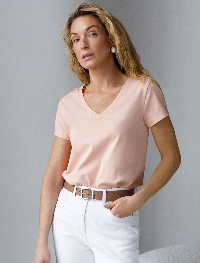 Состав: 92%Хлопок 8%ПУ Плотность: 170 Г/м2 Базовая футболка пудрового цвета с V-образным вырезом выполнена из премиального хлопка. Добавление эластана в состав изделия способствует формоустойчивости. ... Показать описаниеФутболка выполнена из качественного натурального материала, отлично сидит по фигуре и подходит для отдыха и работы. Преимущество этой модели - V-образный вырез, который подчеркивает линию шеи и придает внешнему виду элегантность. Такой фасон гармонично вписывается как в классические, так и в современные гардеробы. Декольте делает изделие более женственным и визуально вытягивает силуэт, создавая ощущение легкости. Такая футболка средней длины и классического кроя идеально подойдет под любую одежду. Модель доступна в больших размерах, чтобы каждая женщина могла подчеркнуть свою индивидуальность.