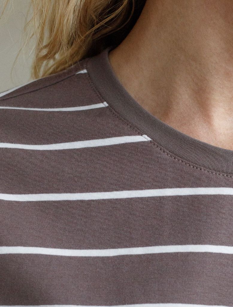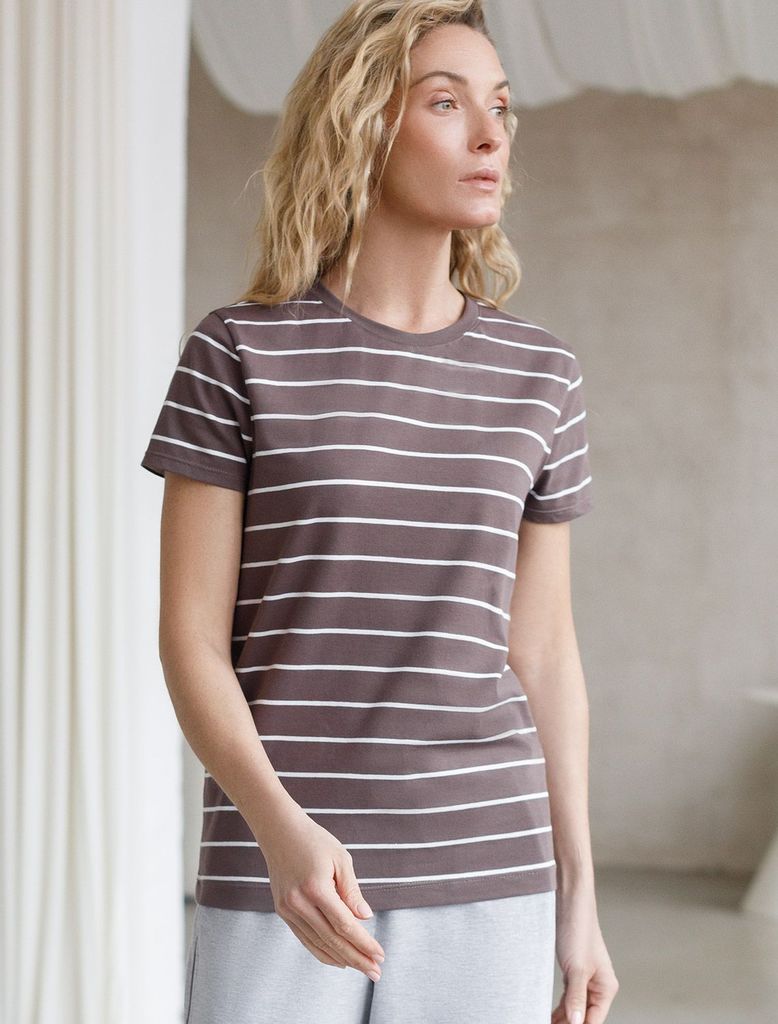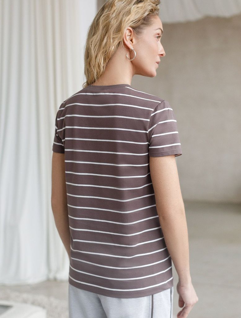 Состав: 92%Хлопок 8%ПУ Плотность: 170 Г/м2 Стильная и модная женская футболка кофейного цвета в белую полоску станет отличным дополнением к вашему гардеробу. Футболка плотностью 170 Г/м2 изготовлена и... Показать описаниез премиального хлопка с добавлением эластана. Добавление эластана в состав изделия способствует формоустойчивости. Эта классическая футболка подходит для создания кэжуал образа на каждый день и идеально подойдет для работы. Модель не мнется, что делает ее практичным вариантом для активных женщин, которые ценят стиль и удобство. Благодаря современному принту полоска эта футболка легко комбинируется с различными элементами гардероба. Она станет универсальным решением для тех, кто предпочитает комфортный стиль casual. Повседневная футболка подчеркнет вашу индивидуальность и позволит вам выглядеть привлекательно в любой ситуации. Легкость в уходе и высокая износостойкость делают ее незаменимой вещью в вашем гардеробе. Одевайте эту модель как на работу, так и на встречу с друзьями — она всегда будет уместна! Стильная и практичная модель с простым кроем и лаконичным дизайном - идеальный вариант для тех, кто ценит качество, минимализм и классический стиль в одежде.