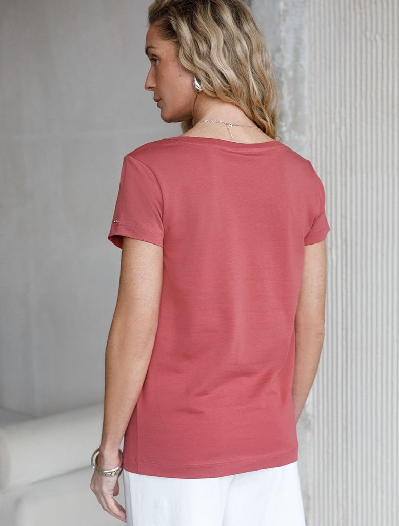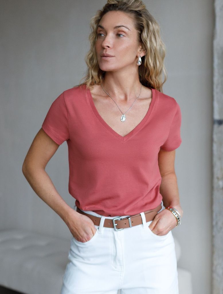 Состав: 92%Хлопок 8%ПУ Плотность: 170 Г/м2 Базовая футболка темно-кораллового цвета с V-образным вырезом выполнена из премиального хлопка плотностью 170 Г/м2. Добавление эластана в состав изделия спос... Показать описаниеобствует формоустойчивости. Футболка выполнена из качественного натурального материала, отлично сидит по фигуре и подходит для отдыха и работы. Преимущество этой модели - V-образный вырез, который подчеркивает линию шеи и придает внешнему виду элегантность. Такой фасон гармонично вписывается как в классические, так и в современные гардеробы. Декольте делает изделие более женственным и визуально вытягивает силуэт, создавая ощущение легкости. Такая футболка средней длины и классического кроя идеально подойдет под любую одежду. Модель доступна в больших размерах, чтобы каждая женщина могла подчеркнуть свою индивидуальность.