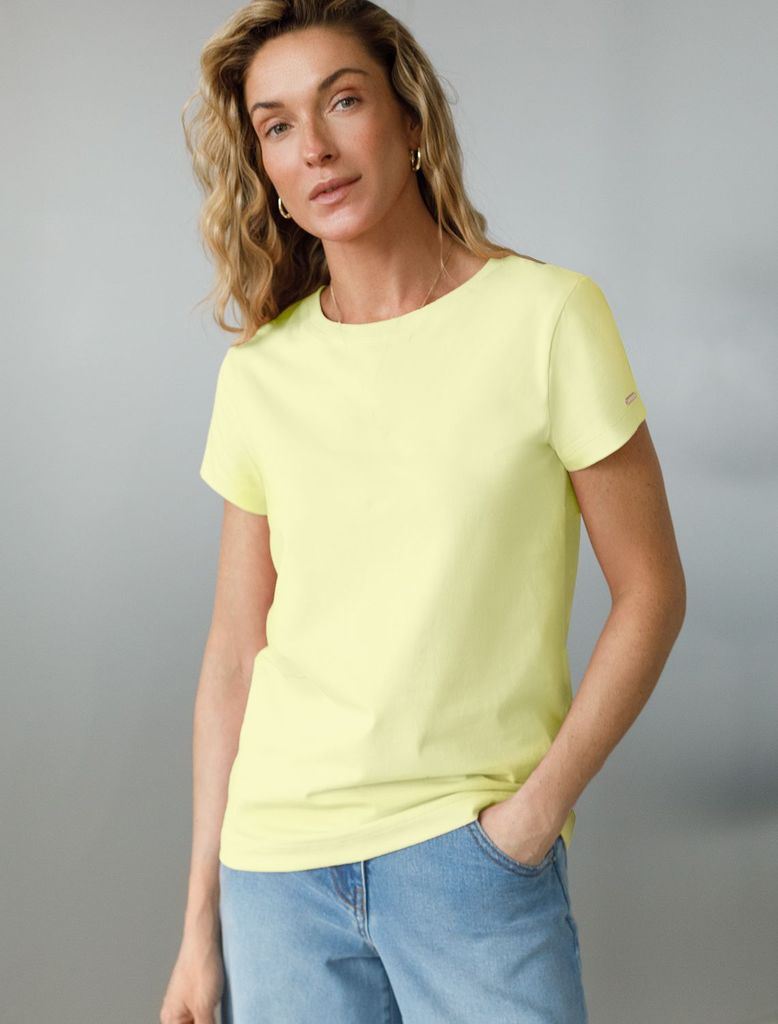 Состав: 92%Хлопок 8%ПУ Плотность: 170 Г/м2 Стильная и модная женская футболка лимонного цвета станет отличным дополнением к вашему гардеробу. Футболка плотностью 170 Г/м2 изготовлена из премиального х... Показать описаниелопка с добавлением эластана. Добавление эластана в состав изделия способствует формоустойчивости. Эта классическая футболка подходит для создания кэжуал образа на каждый день и идеально подойдет для работы. Модель не мнется, что делает ее практичным вариантом для активных женщин, которые ценят стиль и удобство. Благодаря однотонной расцветке эта футболка легко комбинируется с различными элементами гардероба. Она станет универсальным решением для тех, кто предпочитает комфортный стиль casual. Повседневная футболка подчеркнет вашу индивидуальность и позволит вам выглядеть привлекательно в любой ситуации. Легкость в уходе и высокая износостойкость делают ее незаменимой вещью в вашем гардеробе. Одевайте эту модель как на работу, так и на встречу с друзьями — она всегда будет уместна! Стильная и практичная модель с простым кроем и лаконичным дизайном - идеальный вариант для тех, кто ценит качество, минимализм и классический стиль в одежде.