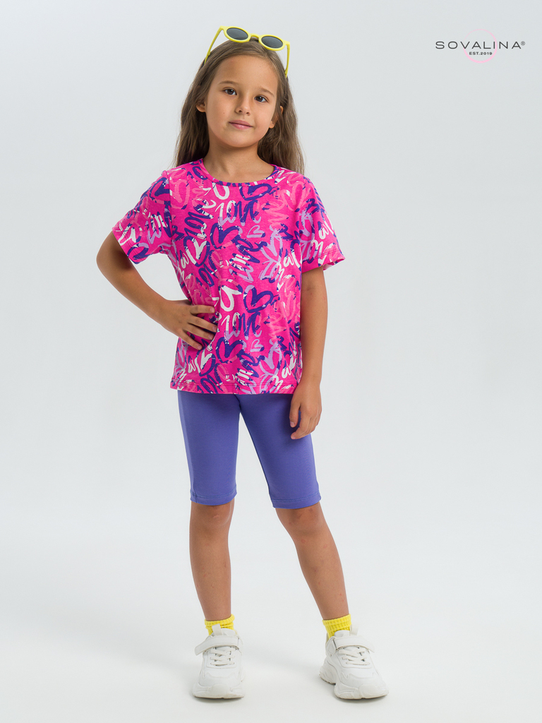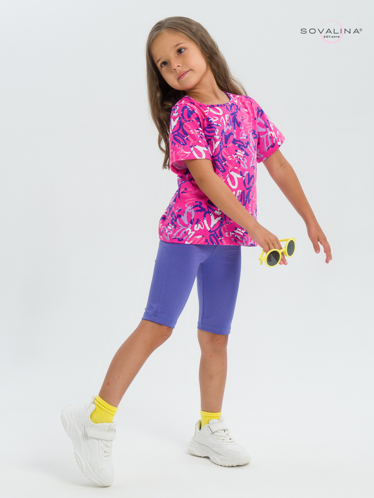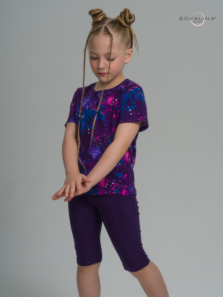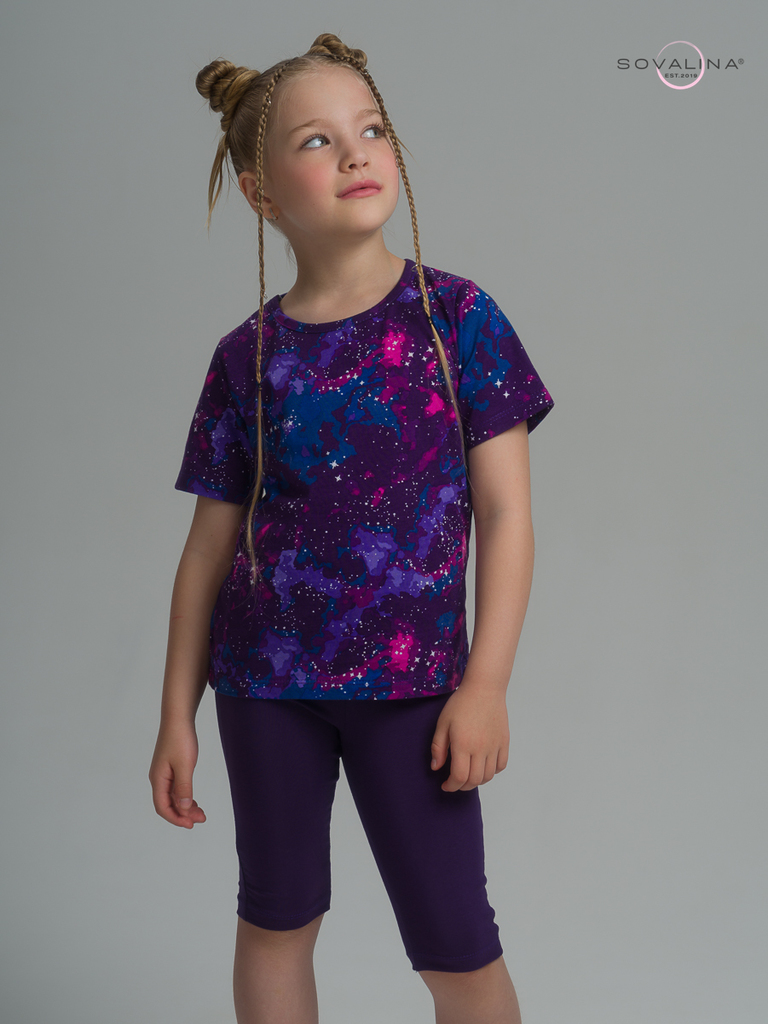 Летний хлопковый комплект для девочки бренда SOVAlina. Детский костюмчик двойка состоит из легкой и красивой футболки с космическим принтом. Она выполнена из тонкого и прочного трикотажа, что делает е... Показать описаниее идеальной на каждый день в садик. Модный спортивный комплект также включает эластичные велосипедки на резинке, обеспечивающие комфортную посадку для танцев или фитнеса. Майка с короткими рукавами и модным дизайном добавляет акцент этому комплекту. Изготовлена из хлопка и обеспечивает максимальный комфорт и свободу движений, подойдет для дома. Этот тонкий и легкий комплект также подходит как форма для тренировок и физкультуры. Он идеально сидит на ребенке и обеспечивает комфорт.