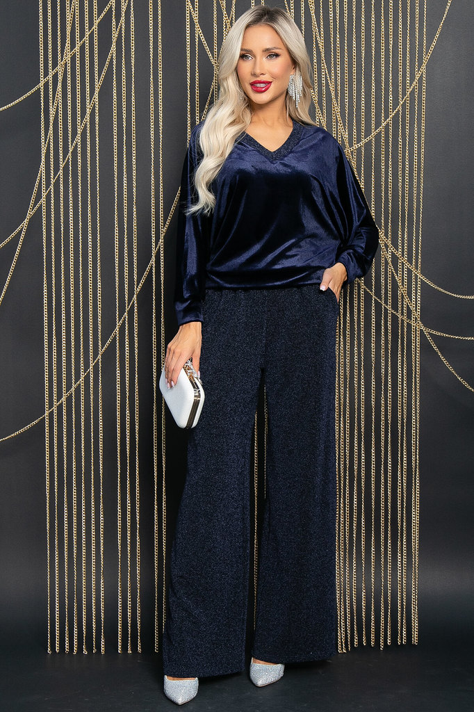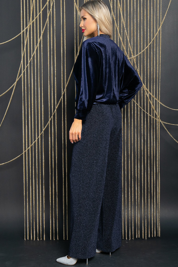 Артикул: К7912. Ткань: трикотаж "Скуба", трикотаж с люрексом. Состав: 95% п/э, 5% эластан. Цвет: темно-синий. Вид застежки: без застёжки. Силуэт: свободный. Карманы: отсутствуют. Тип го... Показать описаниерловины: округлый. Длина изделия блуза по спинке: 44/ 60 см, 46/ 60 см, 48/ 61 см, 50/ 61 см, 52/ 62 см, 54/ 65 см. Длина брюк с учётом резинки: 44-54/ 100 см. Рост модели: 168 см. Костюм-двойка, состоящий из брюк на резинке и блузы свободного кроя. Очень удобный комплект для стильной вечеринки. Если Вы хотите чувствовать себя комфортно на корпоративном вечере или праздничном мероприятии, выбирайте брючный костюм! При желании подчеркнуть талию, верх можно заправить. Блуза свободного кроя, округлый вырез горловины, рукав втачной, укороченный. Брюки прямого кроя, по талии на комфортной резинке. Уход за изделием: ручная стирка до 30 градусов; нельзя отбеливать; деликатный отжим; гладить при t не более 110 С; гладить с изнанки. *Допуск отклонения длины при массовом производстве 1-3 см является нормой.