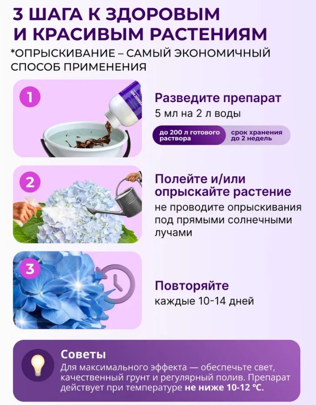 250 мл - 100 литров готового раствора. Витамины для гортензий и азалий это удобрение для цветущих кустарников рекомендуется использовать для питания, здорового роста и развития вересковых культур. Иде... Показать описаниеально подходит для ухода, питания и удобрения: 1. Насыщает растение, субстрат и почву всеми необходимыми витаминами; 2. Укрепляет здоровье и иммунитет растения; 3. Защита от температурный изменений, болезней и недостатка солнечного света. Удобрение для гортензий и азалий - это комплексное жидкое органическое удобрение, разработанное специально для растений вересковых культур, таких как гортензии и азалии, гибискус, рододендроны и другие кустарники. Оно обеспечивает длительное рост и цветения растений благодаря уникальному комплексу натуральных микроэлементов. Это удобрение является водорастворимым и подходит для использования в различных типах грунта. Оно идеально подходит для подкормки кустарников вересковых культур, а также для саженцев и рассады. Весной удобрение помогает гортензиям и азалиям быстро восстановить активный рост на солнечной даче. Оно обеспечивает растения необходимыми питательными веществами, которые поддерживают здоровье растений, стимулируют цветение и развивают крепкие корни. Летом удобрение позволяет растениям сохранять свою красоту в период наиболее интенсивного цветения. Оно стимулирует длительное цветение растений и обеспечивает дополнительную защиту от стресса. Подкормка для гортензий и азалий осенью способствует переходу растений на режим осенней подготовки к зиме. Оно обеспечивает растения необходимыми питательными веществами, которые повышают устойчивость к неблагоприятным условиям. Дайте своим гортензиям и азалиям всё необходимое для красивого цветения на протяжении всего сезона с помощью этого пролонгированного цветочного удобрения для вересковых культур. Создайте яркий и ухоженный сад благодаря этому комплексному органическому удобрению. ИНСТРУКЦИЯ: Расход: 5 мл разбавить в 2 л воды до образования однородного раствора. Вариант 1: поливать почву и растение раствором ближе к корневой системе из расчета 1 л на 1 м2. Вариант 2: опрыскивать растение раствором до полного смачивания листвы. Избегать попадания на бутоны и лепестки цветов. Периодичность: Для комнатных цветов: 1 раз в 2 недели (с мая по октябрь) и 1 раз в 4 недели (с ноября по апрель). Для садовых цветов: 1 раз в две недели (с апреля по август). Регулярное использование АМИНОСИЛ надолго обеспечит обильное цветение и здоровье ваших гортензий. Состав: Азот - 1%, Фосфор - 1,5%, Калий - 2,2%, магний, железо, кальций, медь, цинк, марганец, сера, бор, молибден, Гуминовые вещества