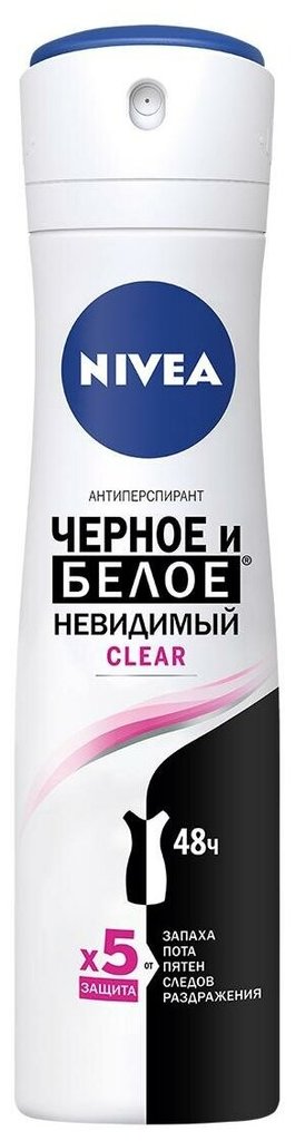 Дезодорант-антиперспирант спрей NIVEA Черное и Белое Невидимый Clear предотвращает появление белых пятен на темной одежде и желтых пятен на светлой одежде. Черная одежда остается черной, а белая одежд... Показать описаниеа дольше остается белой. Уникальная формула имеет 5 факторов защиты: от запаха, пота, пятен, следов и раздражения. Защищает кожу подмышек в течение 48 часов от пота и неприятного запаха. Действует даже в стрессовых ситуациях или на занятиях спортом. Этот чистый, кристальный и яркий сладковатый аромат - выражение естественной женственности. Не содержит этилового спирта.