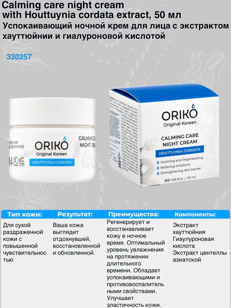 ORIKO Calming care night cream with Houttuynia cordata extract Успокаивающий ночной крем для лица с экстрактом хауттюйнии и гиалуроновой кислотойВопросы по товару