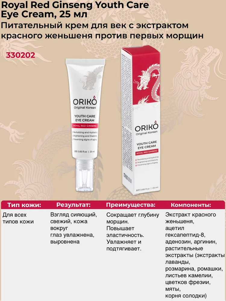 ORIKO Royal Red Ginseng Youth Care Eye Cream Питательный крем для век с экстрактом красного женьшеня против первых морщинВопросы по товару