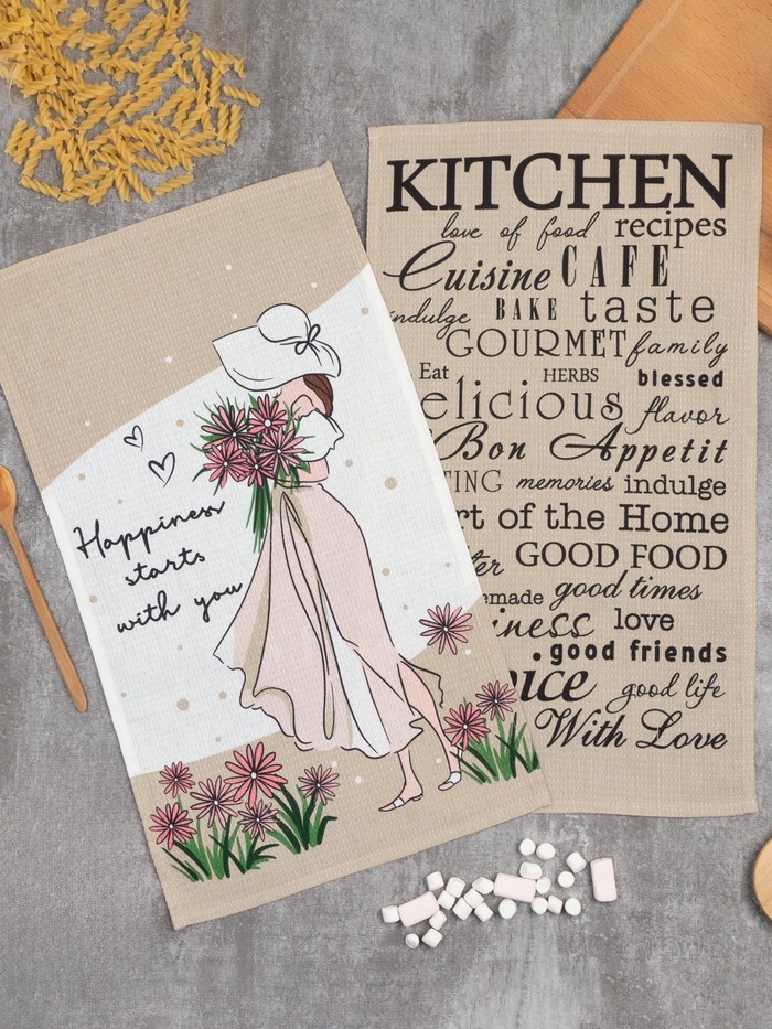 Набор кухонных полотенец Доляна Happiness, 35?60 см -2 шт., 100% хлопок, вафля 160 г/м?