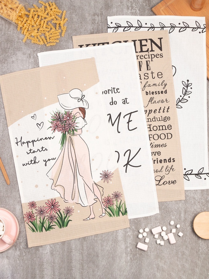 Набор кухонных полотенец Доляна Happiness, 35?60 см -4 шт., 100% хлопок, вафля 160 г/м?