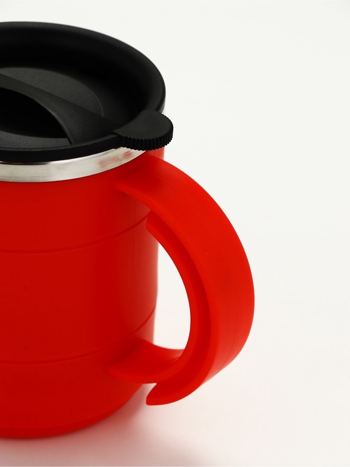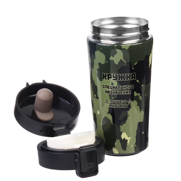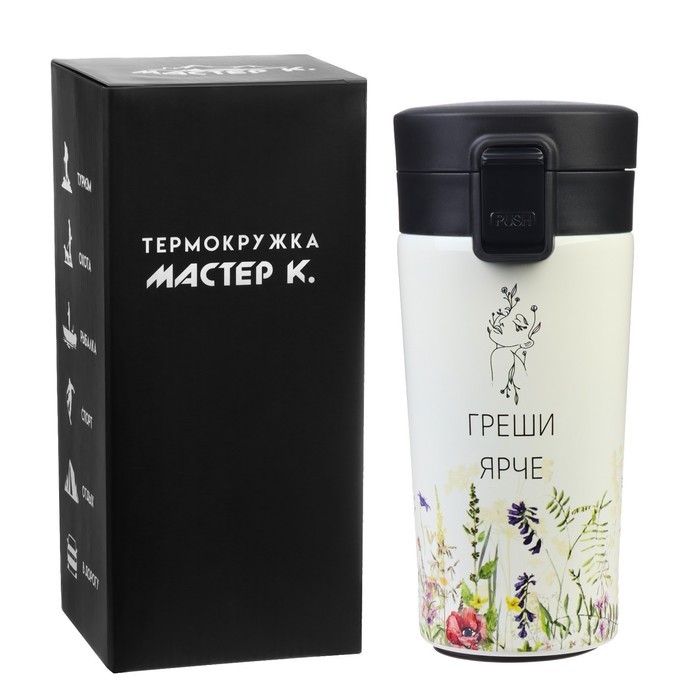 Термокружка для кофе и чая "Мастер К" идеальна для офиса, автомобиля, длительных прогулок и детям в школу. Благодаря специальному покрытию надежно лежит в руке. Термокружка "Мастер К" - это стильный а... Показать описаниексессуар и отличный подарок на новый год, другу, подруге, брату, сестре, девушке, папе, маме, мужу, жене, бабушке и дедушке на день рождения, 23 февраля, 8 марта, 14 февраля. Термокружка сделана из нержавеющей стали марки 304, сконструирована по вакуумной технологии, с двойной стенкой, следовательно, долго держит тепло и не проливается. Снабжена откидывающейся крышкой, изготовленной из экологичного пищевого пластика, имеется кнопка с функцией блокировки, позволяющая с легкостью использовать термос одной рукой. На дне, термокружка имеет специальную прорезиненную основу, предотвращающую царапины на поверхностях. Особенности: * можно открывать и закрывать одной рукой * удобное горлышко (поильник) * нескользящее дно * ставить в автомобильный подстаканник Характеристики: * Открывается с помощью нажатия, есть клапан с защитой от случайного открывания (поднять вверх - закрыть, опустить и нажать - открыть) * 100% защита от протекания * Стильный дизайн, приятна на ощупь * Сохраняет тепло до 8 часов и холод до 8 часов * Двойные стенки из нержавеющей стали * Сеточка из нержавеющей стали для фильтрации напитков * Перед первым применением обдайте внутреннюю колбу кипятком. * После того, как нальёте горячий напиток, через несколько секунд откройте кружку, выпустите пар и снова закройте. Так напиток дольше сохранит температуру. * Нельзя мыть в посудомоечной машине и нагревать в микроволновой печи.
