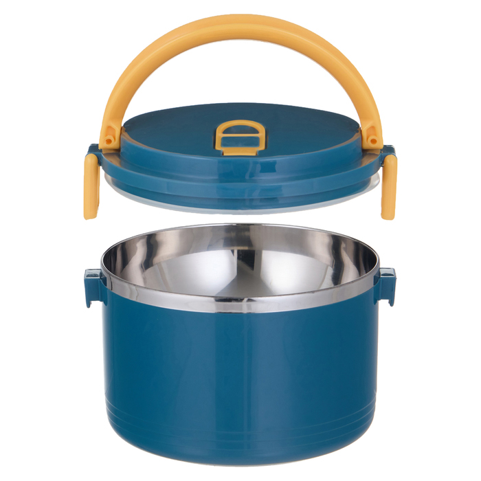Ланч-бокс - это ручной контейнер для пищевых продуктов, используемый для транспортировки еды. Этот стильный и функциональный аксессуар станет незаменимым помощником в повседневной жизни. Среди разнооб... Показать описаниеразия термопосуды ланч-бокс из металлической основы внутри - одна из популярных и универсальных моделей. Ланч-бокс из нержавеющей стали в пластиковом корпусе не содержит вредных веществ и безопасен для здоровья. Особенностью этого ланч-бокса является то, что он состоит из двух отдельных контейнеров. Это очень удобно, так как вы можете взять с собой два разных блюда или разделить одно блюдо на две порции. Между собой секции собираются как "конструктор" через защелки. Благодаря плотно закрывающейся крышке и специальным зажимам, контейнер надежно сохраняет свежесть и аромат ваших блюд, предотвращая протекание и рассыпание. Легкий и компактный размер, позволяет удобно разместить ланч-бокс в сумке или рюкзаке, а приятный синий цвет с голубыми элементами добавит красок в ваш день. Имеется ручка для переноски. Контейнер отлично подходит для любых типов пищи, включая супы, вторые блюда, салаты и десерты. Обеспечивает надёжное сохранение температуры пищи в течение двух часов. Это позволит вам наслаждаться горячими блюдами даже спустя некоторое время после их приготовления, сохраняя их вкусовые качества и полезные свойства. Посуда имеет силиконовую вставку по периметру крышки и клапан, которые обеспечивают герметичность отделения. Клапан на крышке служит для выпуска пара для более легкого открытия контейнера после нахождения в нем горячей пищи. Сфера применения контейнеров в быту разнообразна, их приспосабливают для различных целей, например, для хранения продуктов в холодильнике или организации порядка на кухне. Многоразовый вместительный контейнер с крышкой можно брать с собой на работу и на пикник, на дачу и в школу. Благодаря своей функциональности, удобству использования и стильному дизайну, он станет вашим верным спутником в мире здорового образа жизни и правильного питания. Отличный подарок не только для себя, но и для близких, которые ценят комфорт и практичность в повседневной жизни. Забудьте о неудобных одноразовых упаковках, выберите долговечный и многофункциональный ланч бокс. Балуйте себя и своих близких домашними деликатесами, а термопосуда поможет дольше сохранить вкус и качество продуктов. Перед первым использованием необходимо тщательно вымыть в теплой воде и вытереть насухо. * Высота ланч-бокс - 17.5 см, диаметр - 11.2 см, диаметр внутренний - 10.2 см. * Высота меньшей чаши 5.7 см, глубина - 3.7 см. * Высота большей чаши - 9.3 см, глубина - 7 см. Комплектация Крышка - 1 шт. Контейнер - 2 шт. Дополнительно * Объем верхнего отсека 250 мл * Объем нижнего отсека 500 мл *указан литраж полезного объема