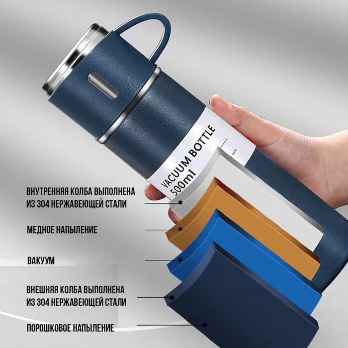 Набор «Мастер К», термос 500 мл и 3 кружки 160 мл, сохраняет тепло 12 ч, нержавеющая сталь, синийВопросы по товару