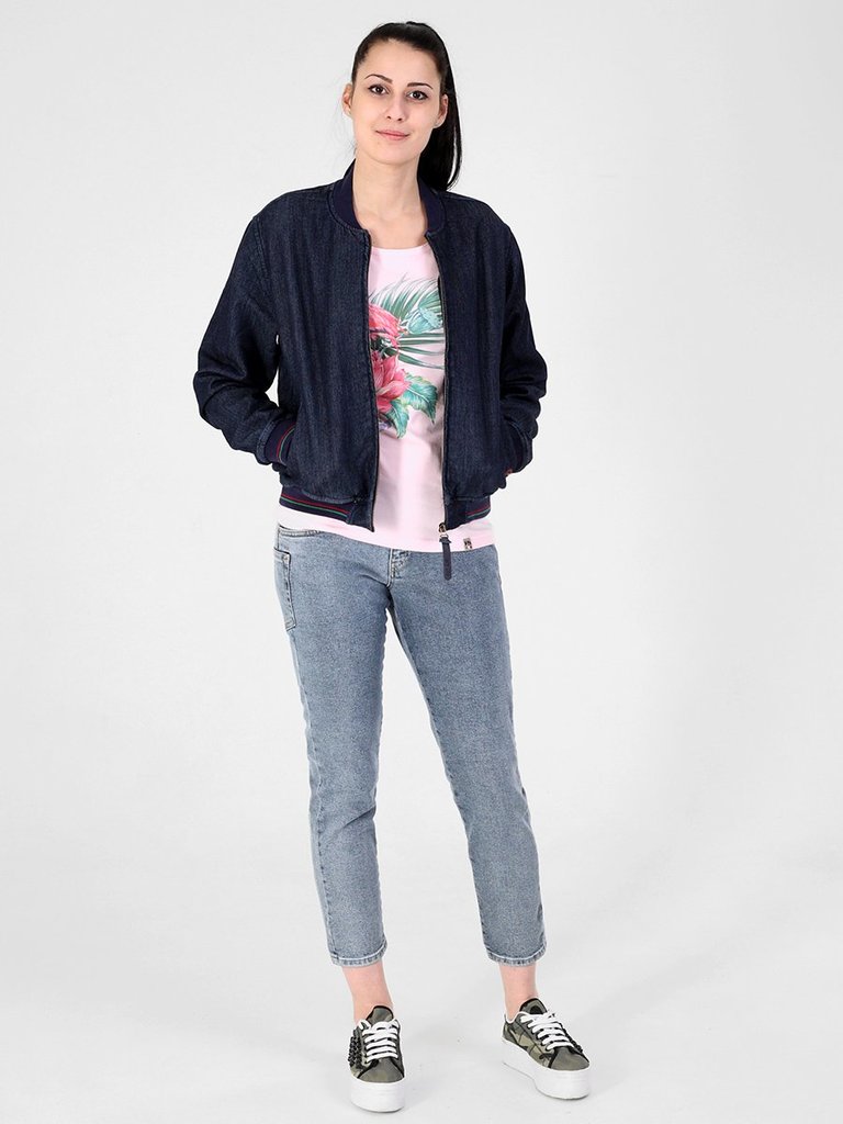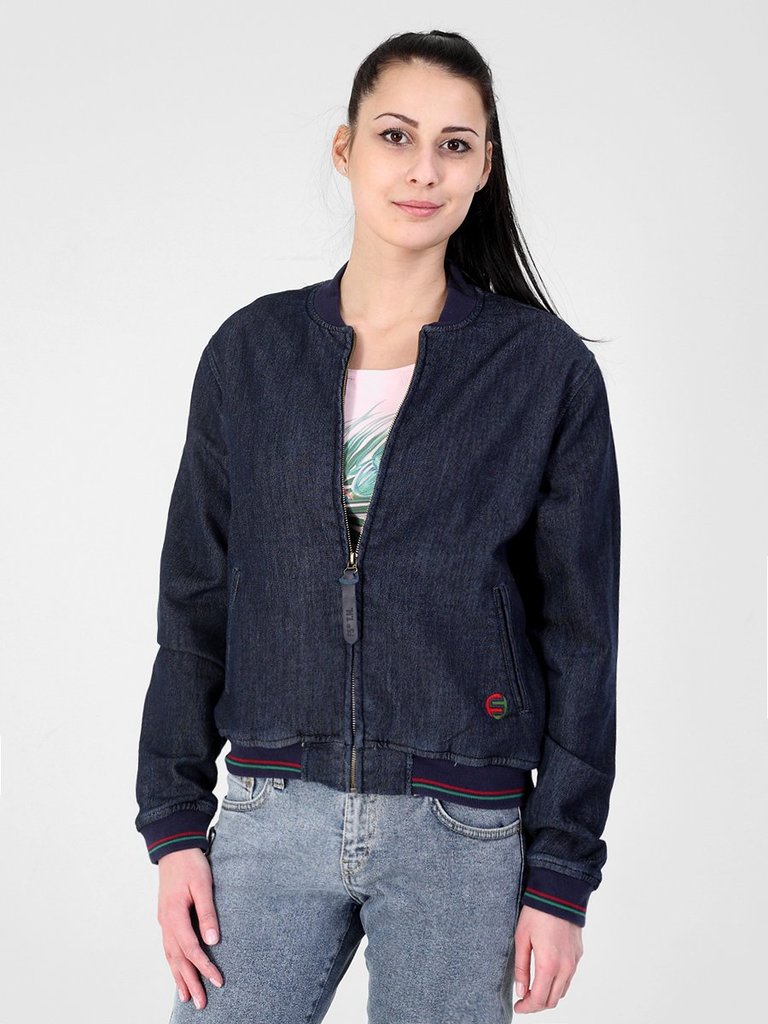 Цвет: стирка темная Состав: 98%Хлопок, 2%Эластан Материал: Blue denim Jersey Вес материала: 300 Фит: Regular fit ID: 297008 Описание Женский модный бомбер, посадка Regular fit, с застежкой на металлич... Показать описаниеескую молнию, двумя боковыми прорезными карманами «в рамку», рядом с левым карманом вышивка. Воротник-стойка, манжеты и низ бомбера из плотной трикотажной «резинки». Бомбер изготовлен из джинсового трикотажного полотна. Изделие постирано, темная стирка.