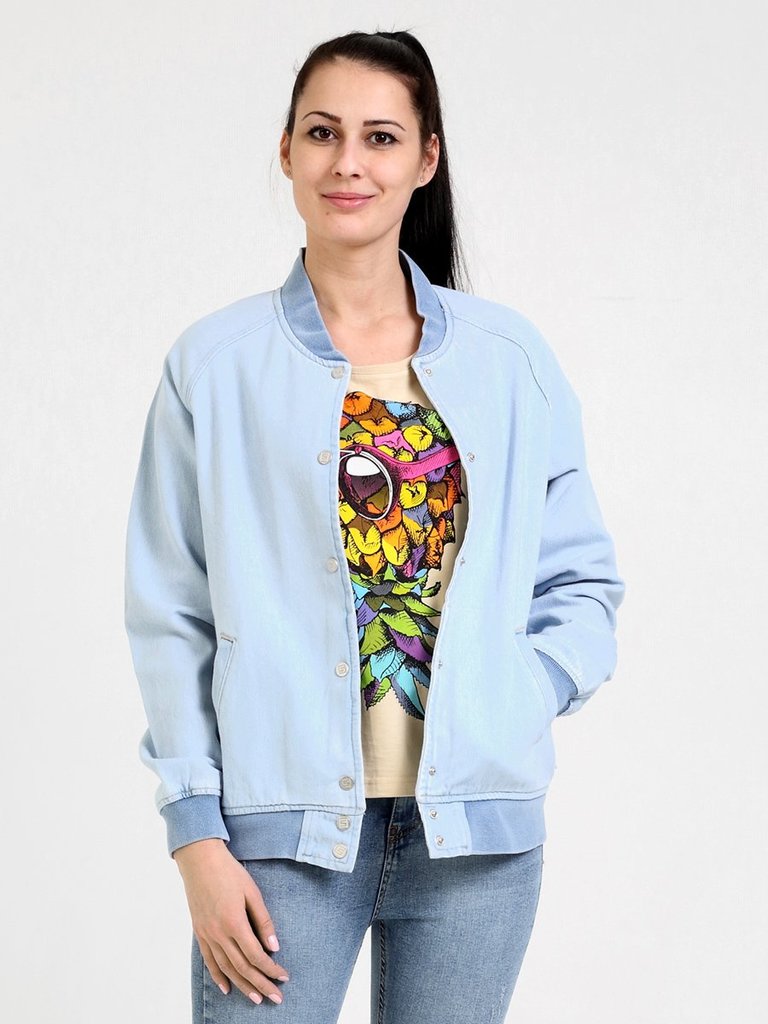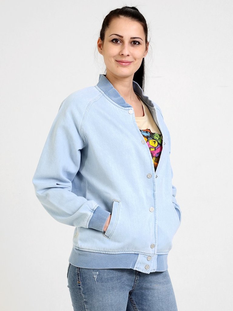 Цвет: стирка светлая Состав: 100%Хлопок Материал: Blue denim Фит: Comfort fit ID: 107014 Описание Женский модный свободный бомбер, посадка Comfort fit, с застежкой на 7 кнопок, двумя боковыми прорезны... Показать описаниеми карманами «в рамку», рядом с левым карманом вышивка. Воротник-стойка, манжеты и низ бомбера из плотной трикотажной «резинки». Бомбер изготовлен из джинсового трикотажного полотна. Изделие постирано, светлая стирка.