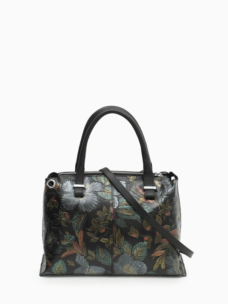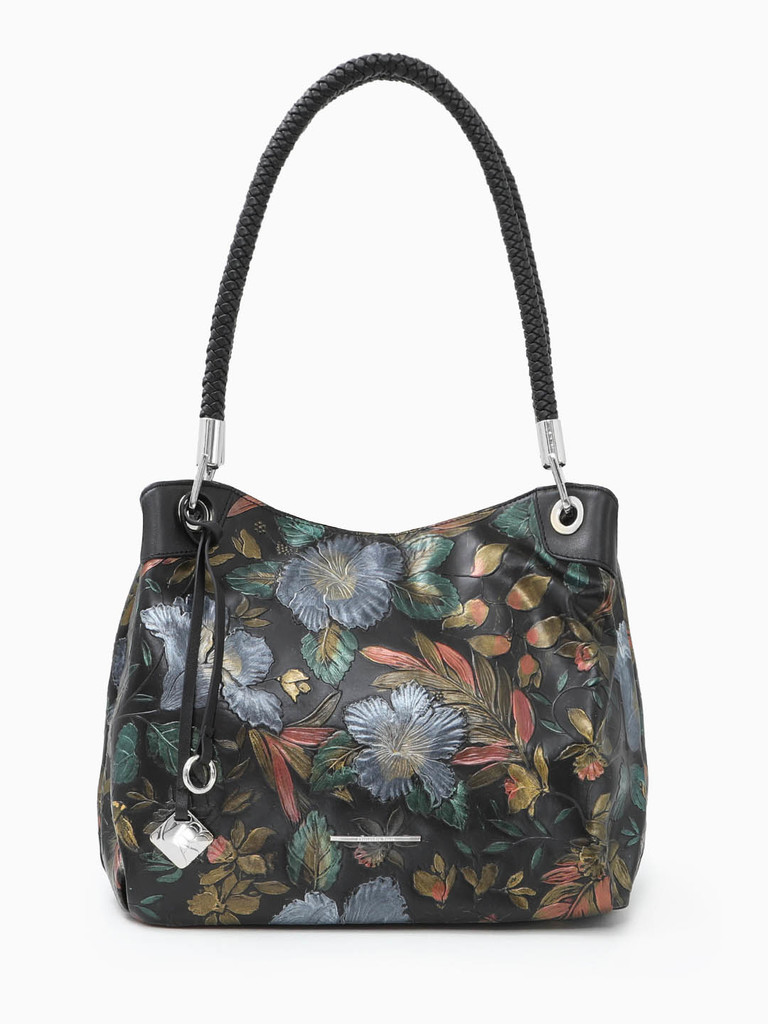Шоппер с длинными плетёными ручками от Alessandro Beato из натуральной кожи черного цвета с объемным тиснением и цветочным принтом