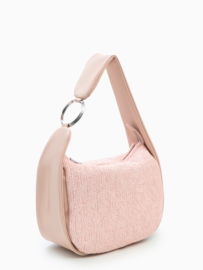 Небольшая сумка-хобо с металлическим кольцом на ручке от ARCADIA из натуральной кожи и рафии пудрового оттенка