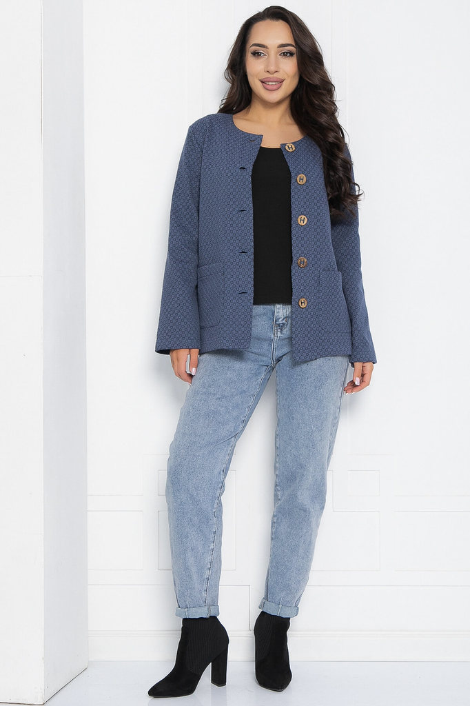 Артикул: Б12371-14. Тип ткани: смесовая. Состав: 100% полиэстер. Материал: трикотаж. Цвет: синий. Принт: мелкий ромбик. Вид застежки: пуговицы. Силуэт: прямой. Карманы: есть. Подкладка:... Показать описание отсутствует. Декоративные элементы: карманы, пуговицы. Длина по спинке от верхней точки плеча: 44-46/ 67 см, 48-52/ 70 см. Размер изделия на модели: 44 Рост модели: 167 см. Элегантный жакет из трикотажа средней плотности в изысканном синем оттенке — это идеальное сочетание женственности и комфорта. Станет универсальным элементом вашего гардероба, подходя как для повседневных, так и для праздничных образов. Оригинальные пуговицы, выполненные под имитацию дерева, придают жакету уникальность и шарм. Уход за изделием: ручная стирка до 30 градусов; нельзя отбеливать; отжим запрещён; гладить при t не более 110 С; гладить с изнанки. Внимание! Рекомендуем ориентироваться на размерную сетку и выбирать свой привычный размер, согласно размерной таблице. *Допуск отклонения длины при массовом производстве 1-3 см является нормой.