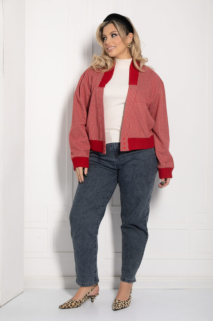Артикул: Б12687-13. Тип ткани: смесовая. Состав: 45% шерсть, 40% вискоза, 10% полиэстер, 5% эластан. Материал: трикотаж пальтовый. Цвет: красный. Принт: клетка. Вид застежки: кнопки. Си... Показать описаниелуэт: свободный. Карманы: есть. Подкладка: отсутствует. Декоративные элементы: отсутствуют. Длина по спинке от верхней точки плеча: 46/ 54 см, 48/ 55 см, 50/ 56 см. Размер изделия на модели: 52 Рост модели: 170 см. Укороченный бомбер-жакет с накладными карманами для прохладных дней. Глубокий V-образный вырез горловины завершается застежкой на три пуговицы. Такой практичный и комфортный жакет можно носить как с брюками, так и с джинсами. Манжеты на талии и рукавах выполнены из эластичной трикотажной резинки. Втачной рукав со спущенным плечевым швом. Уход за изделием: ручная стирка до 30 градусов; нельзя отбеливать; отжим запрещён; гладить при t не более 110 С; гладить с изнанки. Внимание! Рекомендуем ориентироваться на размерную сетку и выбирать свой привычный размер, согласно размерной таблице. *Допуск отклонения длины при массовом производстве 1-3 см является нормой.