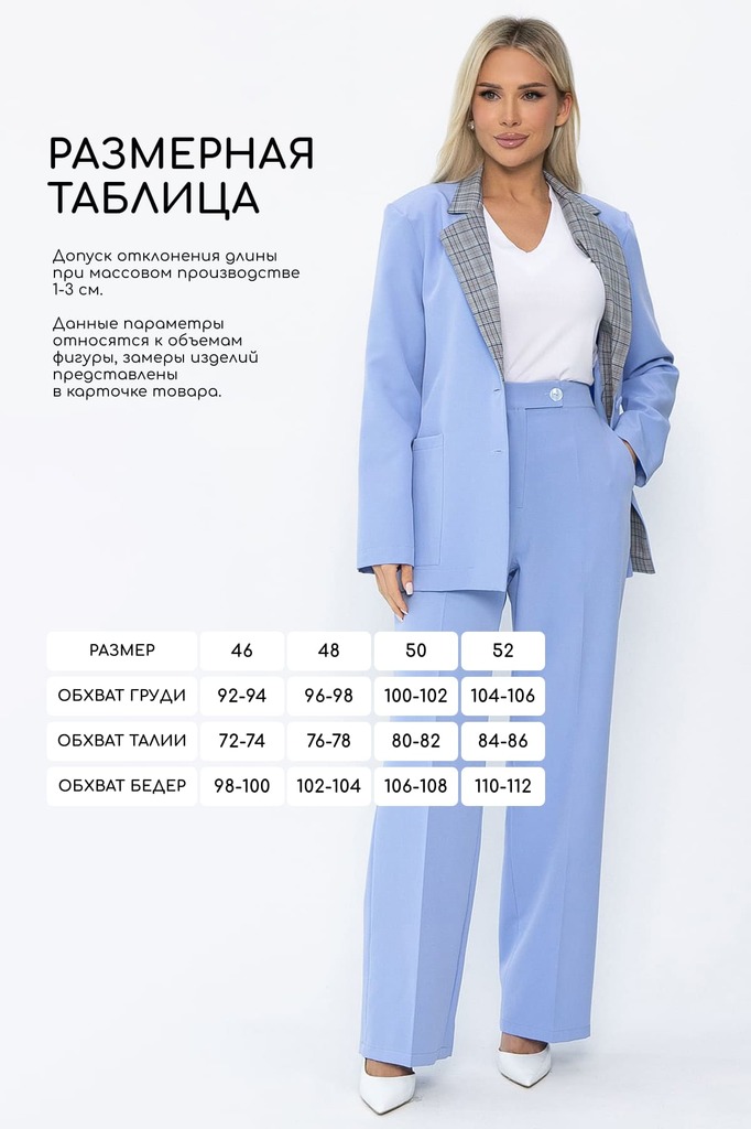 Состав : 95% полиэстер, 5% эластан Материал : костюмный "барби" Цвет : голубой Принт : отсутствует Силуэт : свободный Карманы : есть Подкладка : отсутствует Вид застежки : пуговицы Декоративные элемен... Показать описаниеты : отсутствуют Длина : 46 - 72 см,, 48 - 73 см,, 50 - 74 см,, 52 - 75 см Обхват груди : 46 - 108, 48 - 112, 50 - 116, 52 - 120 Обхват бёдер : 46 - 108, 48 - 112, 50 - 116, 52 - 120 Обхват талии : 46 - 104, 48 - 108, 50 - 112, 52 - 116 Дополнительные параметры размеров : 44 - длина рукава Отснято с брюками Б13890-33М [ https://ltcollection.ru/catalog/bryuki/193581/ ] , с джинсами Б13450-12М [ https://ltcollection.ru/catalog/bryuki/169715/ ] и с блузкой Б13553-33М [ https://ltcollection.ru/catalog/bluzki/170598/ ] Создайте безупречный деловой образ с нашим классическим женским пиджаком. Этот элегантный пиджак идеально подходит как для офисных встреч, так и для вечерних мероприятий. Он оснащён полными рукавами, которые придают ему стильный вид, а также подплечниками, добавляющими уверенности и строгости вашему образу. Удобные карманы позволят вам всегда иметь под рукой необходимые мелочи. Этот пиджак станет универсальным элементом вашего гардероба, легко сочетаясь с различными нарядами. Выберите стиль и комфорт с нашим классическим пиджаком! Внимание! Рекомендуем ориентироваться на размерную сетку и выбирать свой привычный размер, согласно размерной таблице. *Допуск отклонения длины при массовом производстве 1-3 см является нормой. Уход за изделием: Ручная стирка или стирка в машине при температуре до 30 °C, деликатный режим. Не использовать отбеливатели. Разрешена глажка при температуре до 110 °C. При глажке использовать специальную насадку на подошве утюга, гладить с паром. Не замачивать и не выжимать. Стирать изделие наизнанку, отдельно от других вещей.