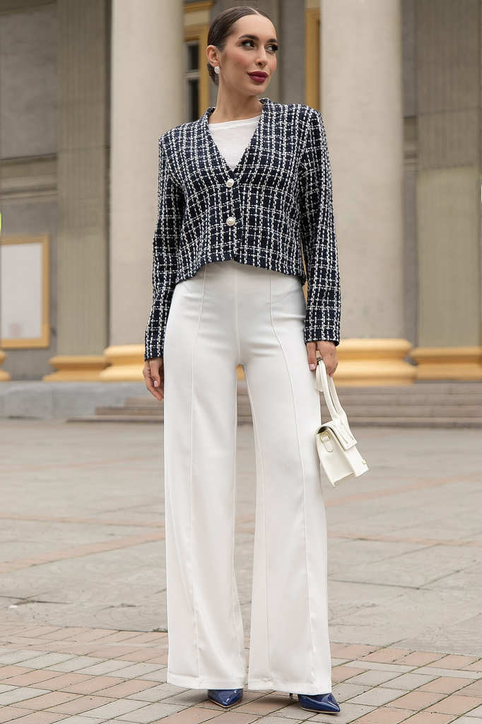 Состав : 40% хлопок, 30% вискоза, 30% полиэстер Материал : твид Цвет : синий Принт : клетка Силуэт : прямой Карманы : отсутствуют Подкладка : отсутствует Вид застежки : пуговицы Декоративные элементы ... Показать описание: отсутствуют Длина : 44 - 53 см,, 46 - 54 см,, 48 - 55 см,, 50 - 56 см,, 52 - 57 см,, 54 - 58 см Обхват груди : 44 - 100, 46 - 104, 48 - 108, 50 - 112, 52 - 116, 54 - 120 Обхват бёдер : 44 - 100, 46 - 104, 48 - 108, 50 - 112, 52 - 116, 54 - 120 Обхват талии : 44 - 100, 46 - 104, 48 - 108, 50 - 112, 52 - 116, 54 - 120 Дополнительные параметры размеров : 44 - длина рукава Отснято с белыми брюками Б12685-13 [ https://ltcollection.ru/catalog/bryuki/161858/ ] и с джинсами Б13450-12М [ https://ltcollection.ru/catalog/bryuki/169715/ ] Женский укороченный твидовый жакет — это воплощение классики и стиля, перед которым невозможно устоять. Он идеально подходит как для деловых встреч, так и для повседневного образа. Легко сочетается с джинсами, юбкой-карандаш или брюками. Этот жакет подчеркнет вашу индивидуальность и добавит нотку изысканности. Он гармонично впишется в гардероб каждой женщины, которая хочет выглядеть стильно и уверенно. Внимание! Рекомендуем ориентироваться на размерную сетку и выбирать свой привычный размер, согласно размерной таблице. *Допуск отклонения длины при массовом производстве 1-3 см является нормой. Уход за изделием: Ручная стирка или стирка в машине при температуре до 30 °C, деликатный режим. Не использовать отбеливатели. Разрешена глажка при температуре до 110 °C. При глажке использовать специальную насадку на подошве утюга, гладить с паром. Не замачивать и не выжимать. Стирать изделие наизнанку, отдельно от других вещей.