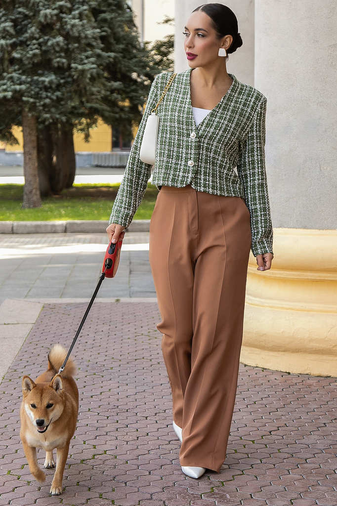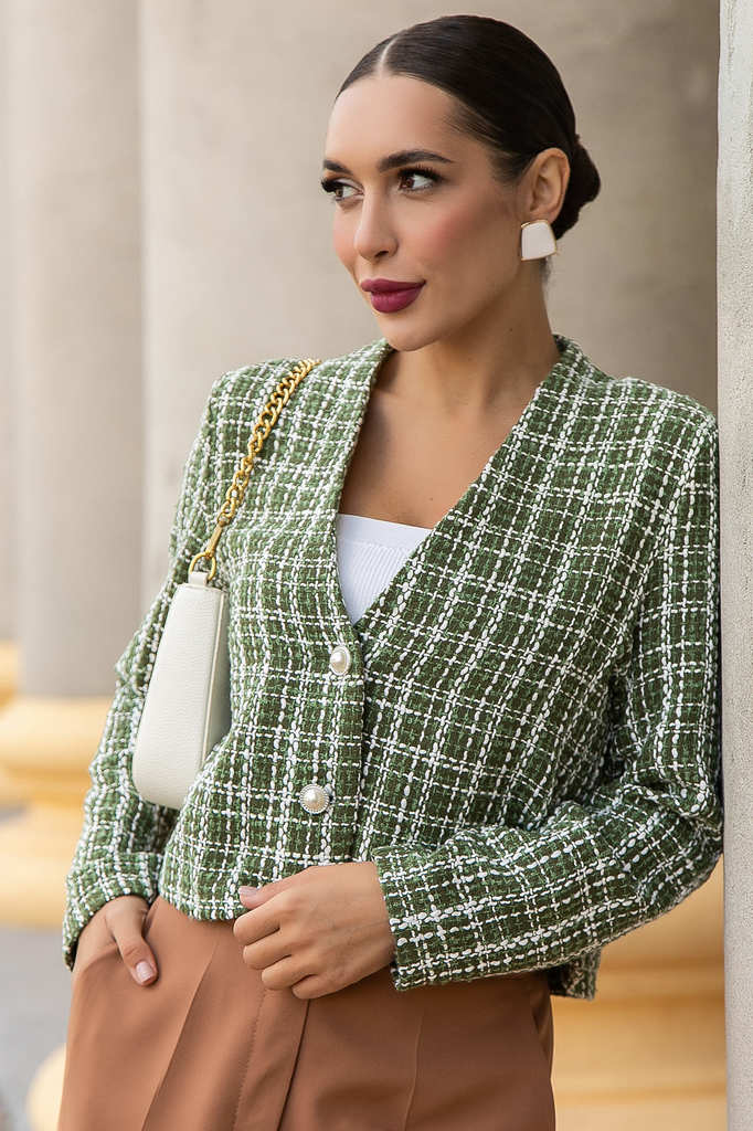 Состав : 40% хлопок, 30% вискоза, 30% полиэстер Материал : твид Цвет : зеленый Принт : клетка Силуэт : прямой Карманы : отсутствуют Подкладка : отсутствует Вид застежки : пуговицы Декоративные элемент... Показать описаниеы : отсутствуют Длина : 44 - 53 см,, 46 - 54 см,, 48 - 55 см,, 50 - 56 см,, 52 - 57 см,, 54 - 58 см Обхват груди : 44 - 100, 46 - 104, 48 - 108, 50 - 112, 52 - 116, 54 - 120 Обхват бёдер : 44 - 100, 46 - 104, 48 - 108, 50 - 112, 52 - 116, 54 - 120 Обхват талии : 44 - 100, 46 - 104, 48 - 108, 50 - 112, 52 - 116, 54 - 120 Дополнительные параметры размеров : 44 - длина рукава Отснято с брюками Б14106-33М [ https://ltcollection.ru/catalog/bryuki/196505/ ] и с джинсами Б13450-12М [ https://ltcollection.ru/catalog/bryuki/169715/ ] Женский укороченный твидовый жакет — это воплощение классики и стиля, перед которым невозможно устоять. Он идеально подходит как для деловых встреч, так и для повседневного образа. Легко сочетается с джинсами, юбкой-карандаш или брюками. Этот жакет подчеркнет вашу индивидуальность и добавит нотку изысканности. Он гармонично впишется в гардероб каждой женщины, которая хочет выглядеть стильно и уверенно. Внимание! Рекомендуем ориентироваться на размерную сетку и выбирать свой привычный размер, согласно размерной таблице. *Допуск отклонения длины при массовом производстве 1-3 см является нормой. Уход за изделием: Ручная стирка или стирка в машине при температуре до 30 °C, деликатный режим. Не использовать отбеливатели. Разрешена глажка при температуре до 110 °C. При глажке использовать специальную насадку на подошве утюга, гладить с паром. Не замачивать и не выжимать. Стирать изделие наизнанку, отдельно от других вещей.