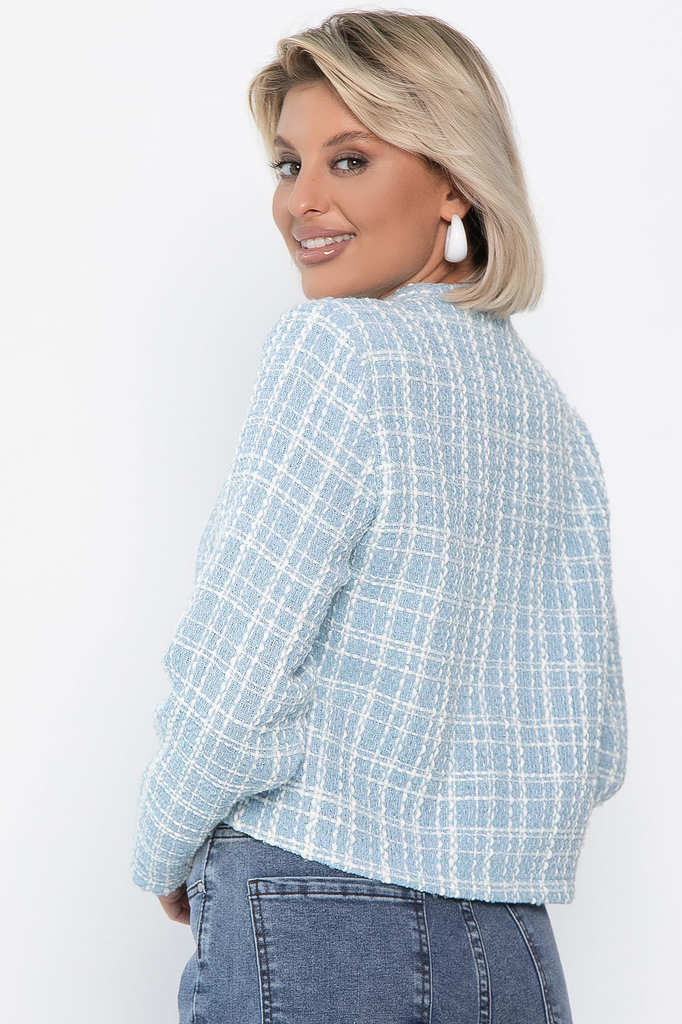 Состав : 40% хлопок, 30% вискоза, 30% полиэстер Материал : твид Цвет : голубой Принт : клетка Силуэт : прямой Карманы : отсутствуют Подкладка : отсутствует Вид застежки : пуговицы Декоративные элемент... Показать описаниеы : отсутствуют Длина : 44 - 53 см,, 46 - 54 см,, 48 - 55 см,, 50 - 56 см,, 52 - 57 см,, 54 - 58 см Обхват груди : 44 - 100, 46 - 104, 48 - 108, 50 - 112, 52 - 116, 54 - 120 Обхват бёдер : 44 - 100, 46 - 104, 48 - 108, 50 - 112, 52 - 116, 54 - 120 Обхват талии : 44 - 100, 46 - 104, 48 - 108, 50 - 112, 52 - 116, 54 - 120 Дополнительные параметры размеров : 44 - длина рукава Отснято с брюками Б14103-34М [ https://ltcollection.ru/catalog/bryuki/196510/ ] и с джинсами Б13450-12М [ https://ltcollection.ru/catalog/bryuki/169715/ ] Женский укороченный твидовый жакет — это воплощение классики и стиля, перед которым невозможно устоять. Он идеально подходит как для деловых встреч, так и для повседневного образа. Легко сочетается с джинсами, юбкой-карандаш или брюками. Этот жакет подчеркнет вашу индивидуальность и добавит нотку изысканности. Он гармонично впишется в гардероб каждой женщины, которая хочет выглядеть стильно и уверенно. Внимание! Рекомендуем ориентироваться на размерную сетку и выбирать свой привычный размер, согласно размерной таблице. *Допуск отклонения длины при массовом производстве 1-3 см является нормой. Уход за изделием: Ручная стирка или стирка в машине при температуре до 30 °C, деликатный режим. Не использовать отбеливатели. Разрешена глажка при температуре до 110 °C. При глажке использовать специальную насадку на подошве утюга, гладить с паром. Не замачивать и не выжимать. Стирать изделие наизнанку, отдельно от других вещей.