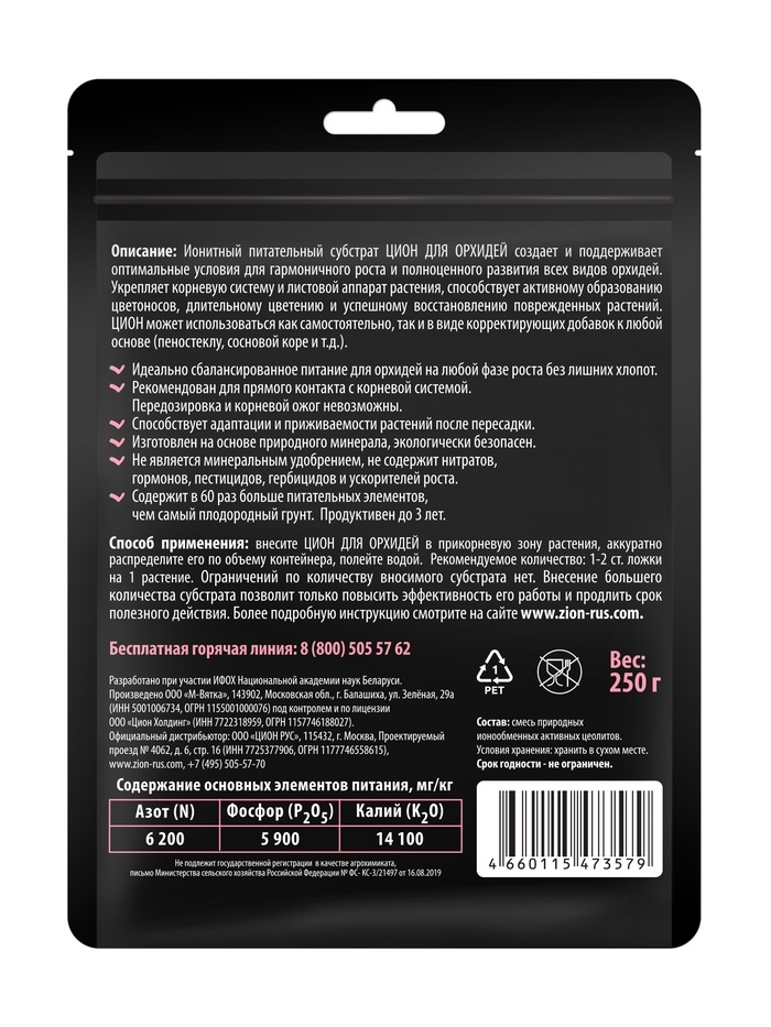 Ионитный субстрат для орхидей на основе цеолита, 250 г — это крупная фасовка специализированного компонента для орхидей растений. Продукт предназначен для создания рыхлой, воздухопроницаемой среды, кр... Показать описаниеитически важной для здоровья воздушных корней и устойчивого цветения орхидей. * Фракционированный цеолит в основе: минеральный компонент обеспечивает стабильную структуру грунта, предотвращает его слёживание и закисание, поддерживая оптимальный газообмен. * Оптимальные условия для корней орхидеи: субстрат создаёт среду для активного развития корневой системы. Здоровые корни эффективно поглощают влагу и питание, что служит основой для интенсивного роста листвы и выгонки цветоносов. * Безопасный и чистый состав: продукт экологически безопасен, не содержит искусственных гормонов, химических ускорителей роста или посторонних примесей. Принцип действия и результат: цеолит работает как буфер: впитывает излишки влаги при поливе и постепенно отдаёт её корням, снижая риск переувлажнения и загнивания. Это поддерживает стабильный водно-воздушный режим, помогает растению легче переносить стресс после пересадки. Использование цеолитового субстрата — это надежный способ обеспечить орхидеям комфортные условия для долгой жизни. Применение Внесите субстрат в предкорневую зону растения, аккуратно распределите его по объёму контейнера, полейте водой. Рекомендуемое соотношение: 1-2 столовых ложки субстрата (30 г) на 1 литр грунта. Ограничений по количеству вносимого субстрата нет. Внесение большего количества субстрата позволит только повысить эффективность его работы и продлить срок полезного действия.
