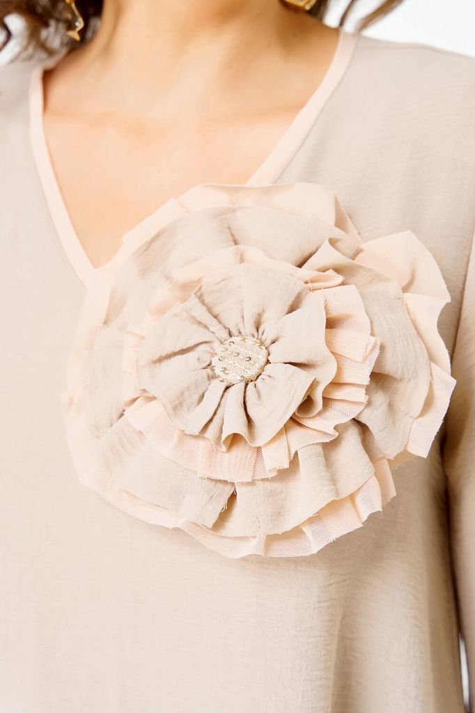 Состав: Вискоза-32%; ПЭ-65%; Спандекс-3%; Блузка женская A-силуэта с втачным рукавом. Вырез горловины v- образной формы. Спинка цельная. Рукав длинной 7/8 расширенный к низу. Горловина и рукава по н... Показать описаниеизу оформлены бейкой из отделочной ткани. Украшением служит съемный цветок. Длина по спинке: 80 см Длина рукава: 50 см
