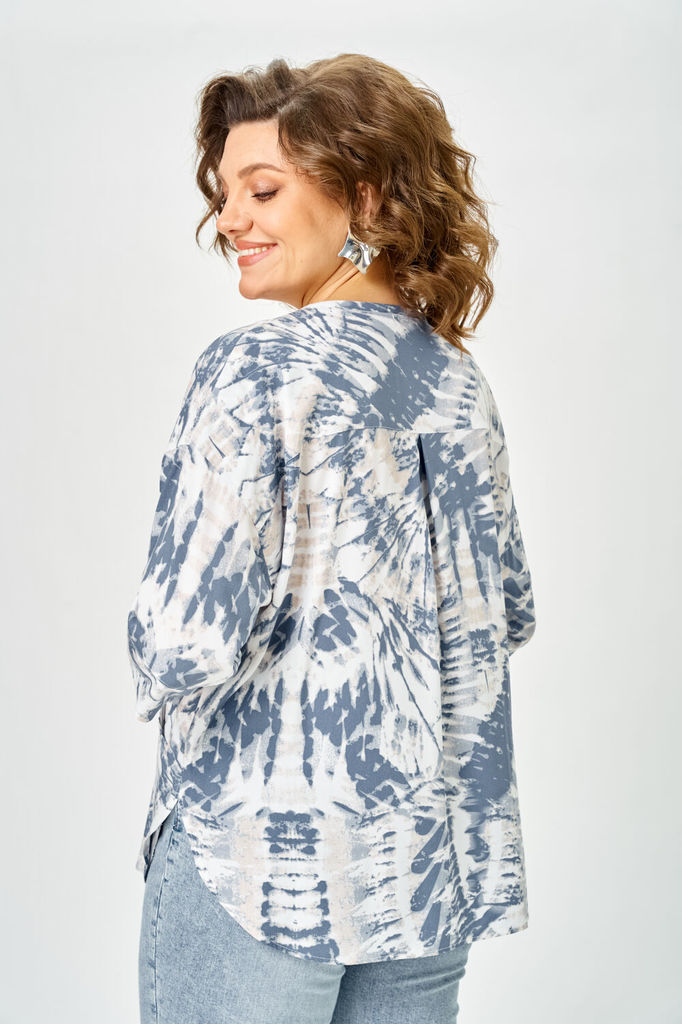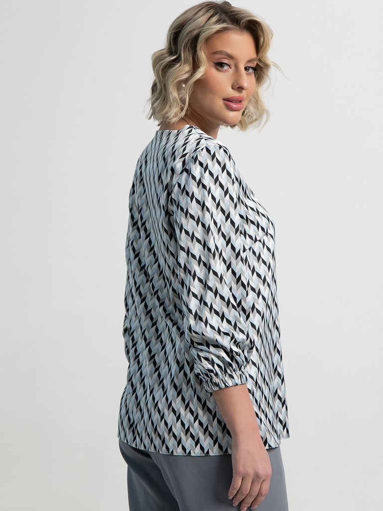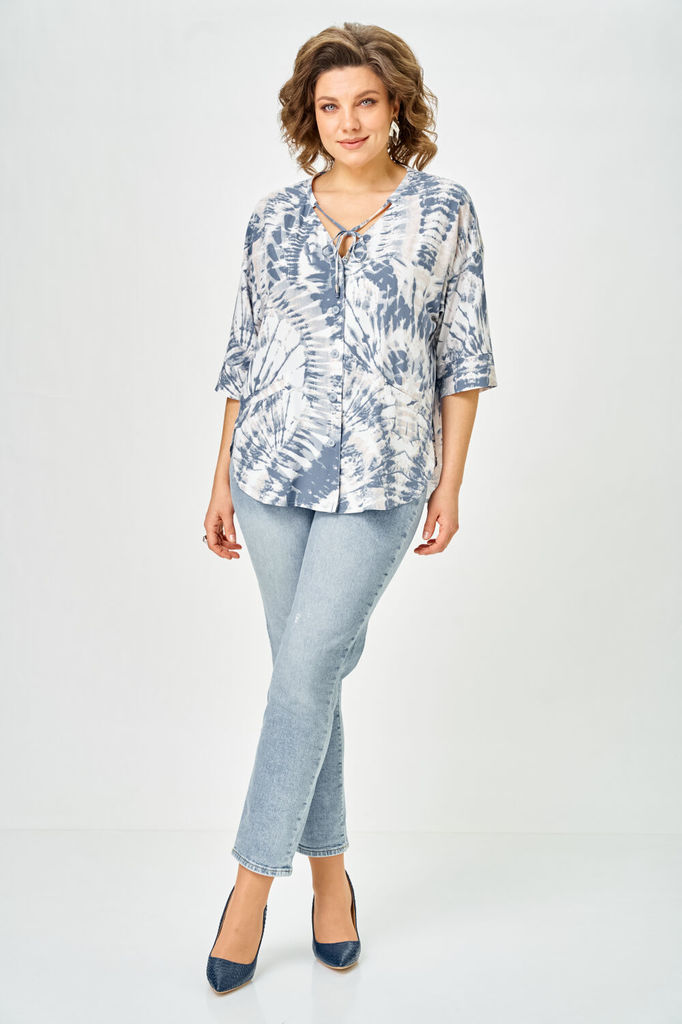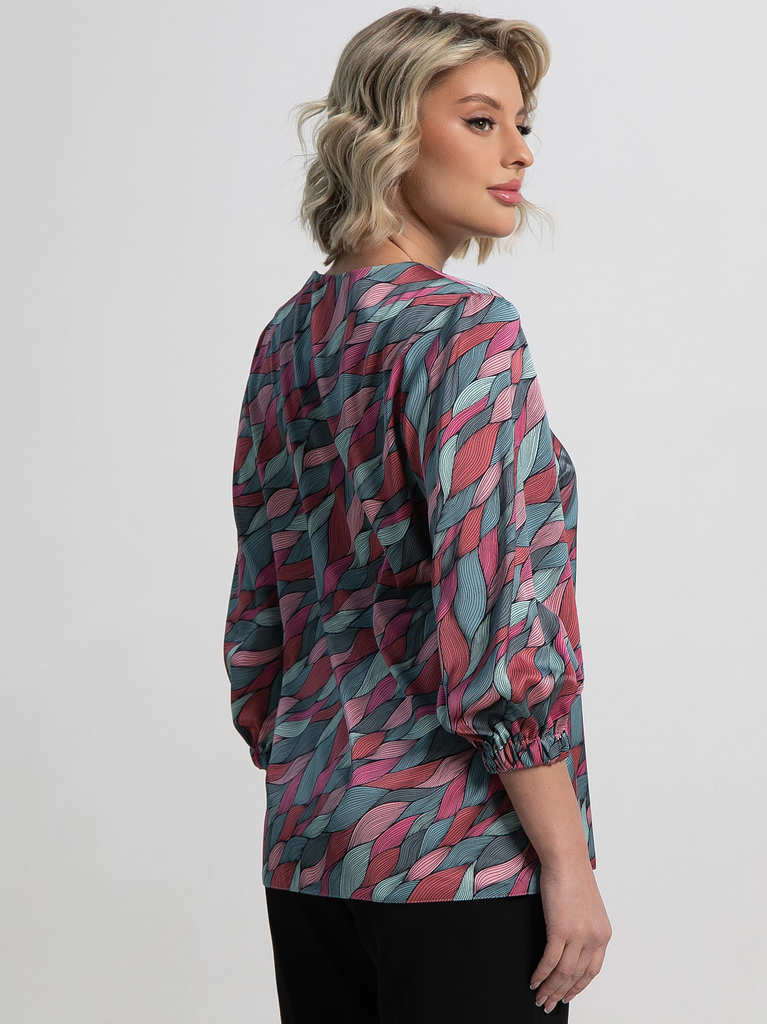 Состав: Вискоза-78%; ПЭ-20%; Эластан-2%; Блузка из мягкой вискозной ткани свободного силуэта со спущенной линией плеча. Горловина по полочке округлой формы, по спинке – V-образный вырез, который соеди... Показать описаниенён планкой. Рукав длиной 3/4. Низ блузки и низ рукавов присобраны на декоративный трикотажный довяз. Длина блузки от высшей плечевой точки р.50,52,54 – 67(+/-1) см., р.56,58,60 – 69(+/-1) см. Длина рукава с манжетой от высшей плечевой точки – 55(+/-1) см.