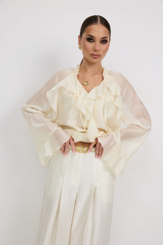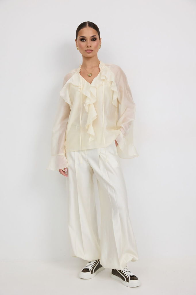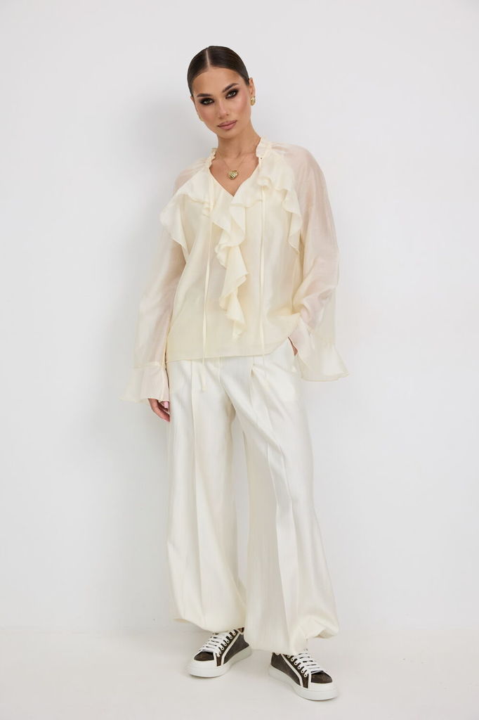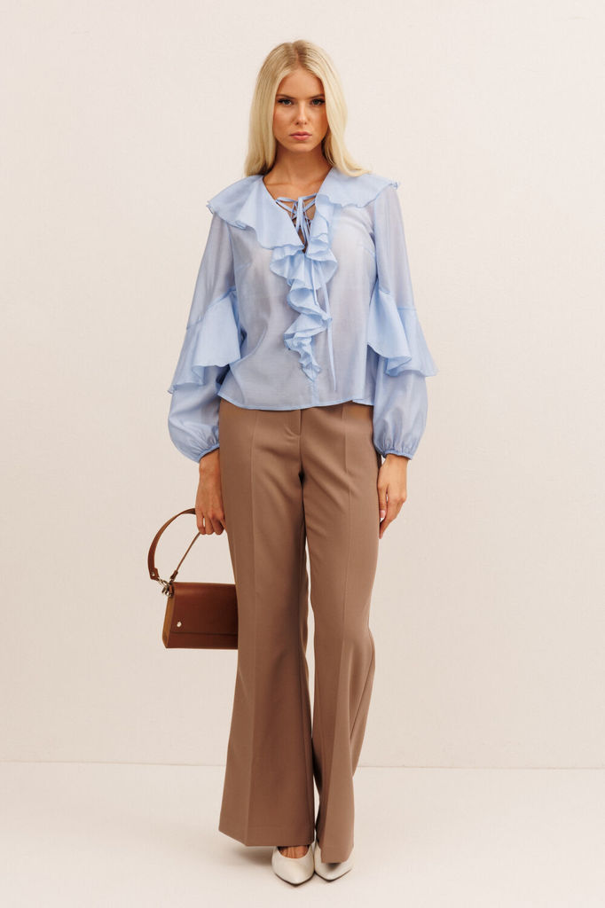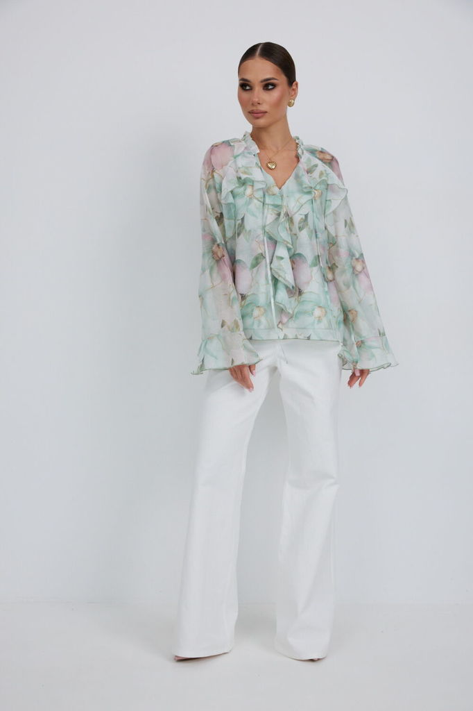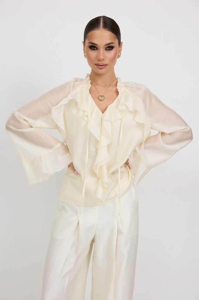 Состав: Лиоцелл-85%; ПЭ-15%; Блузка: - прямой силуэт - романтический стиль - струящиеся воланы по горловине и рукавам - завязки по горловине - объёмный длинный рукав - низ рукава на резинки
