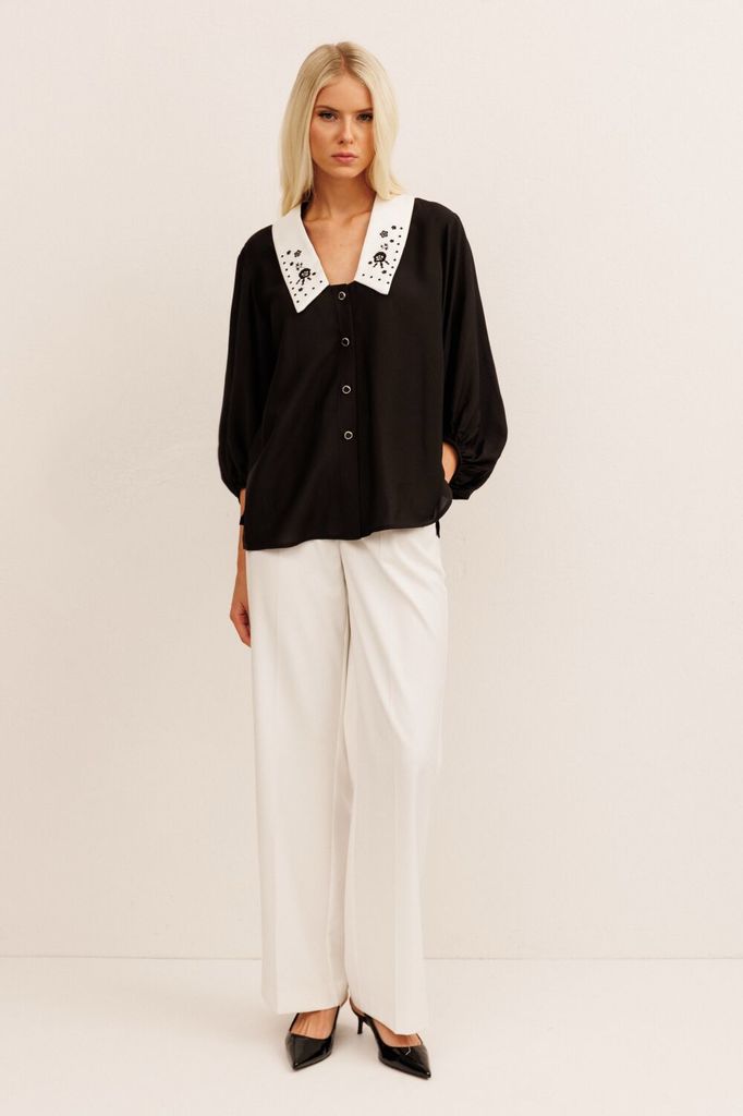 Состав: ПЭ-97%; Спандекс-3%; Блузка женская прямого кроя, с втачным рукавом. Горловина v- образной формы с воротником стойкой декорирована контрастной шнуровкой. Спинка цельная. Рукав длинный ... Показать описаниесо сборкой по окату, низ рукава присобран на притачную манжету с застежкой на петлю и пуговицу. В боковых швах обработаны разрезы. Длина блузки по спинке: 73 см Длина рукава: 61 см