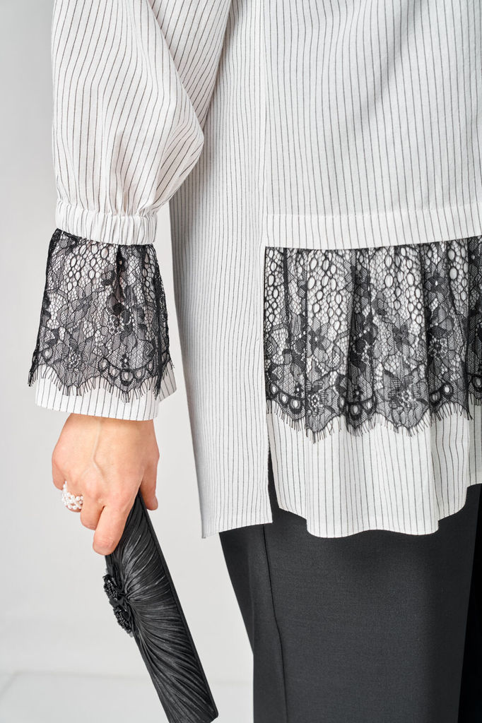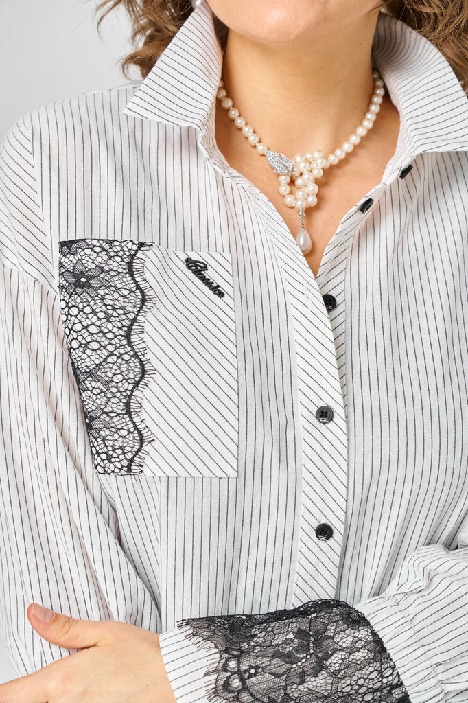 Состав: ПА-26%; Хлопок-71%; Эластан-3%; Отшивается на заказ от двух недель. Блузка женская нарядно повседневного элегантного стиля, прямого силуэта с фигурным низом выполнена из шикарного дышащего хло... Показать описаниепка в полоску в сочетании с красивым дорогим кружевом. Вырез горловины воротник на стойке рубашечного типа, застежка доверху на обметанные петли и пуговицы. Рукав спущенный, втачной по низу на притачной манжете, в боковых швах обработаны разрезы. На полочке функциональный накладной карман с отделкой из красивого кружева, изящная металлическая бренд лейбл и контрасные пуговицы придают изделию стильный и современный дизайн. Подрез с декоративным кружевом делает изделие трендом сезона. По спинке фигурная кокетка и встречная складка, создают идеальную посадку. Универсальный силуэт, элегантный крой, стильный дизайн - все детали только подчеркивают достоинства фигуры, а декор из кружева создает трендовый образ.