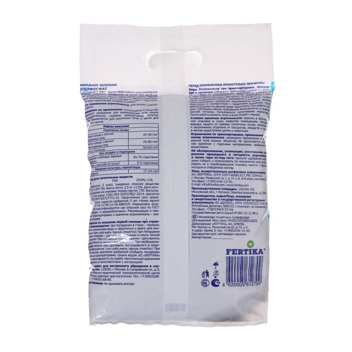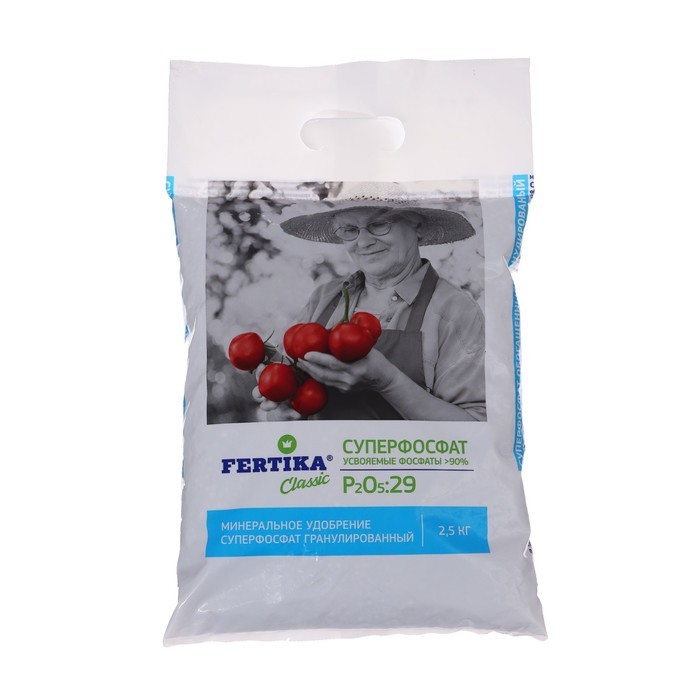 Удобрение Фертика «Суперфосфат» — универсальный минеральный состав для открытого и защищенного грунта. Вносится как основное удобрение перед посадкой и в качестве подкормки на протяжение периода вегет... Показать описаниеации. Имеет форму гранул. В состав входит фосфор, азот, калий, вспомогательные вещества — сера, магний, кальций. Оптимально для щелочной и нейтральной почвы. При внесении в кислую рекомендуется перемешивать с известняком или мелом. Используется для разных культур — овощных, плодово-ягодных, цветочных.Действие удобренияОбеспечивает развитие мощной корневой системы.Способствует повышению урожайности.Стимулирует скорейшее созревание.Улучшает качество и внешний вид плодов.