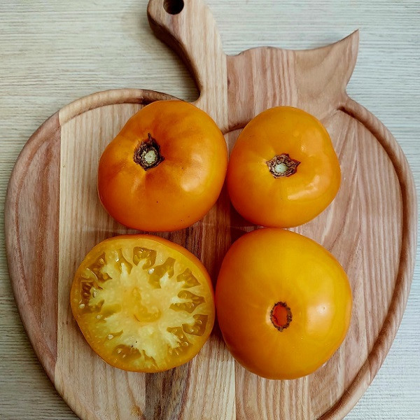 Очень красивые жёлто-оранжевые сердца в среднем по 200г. Мякоть плотная. Куст высокорослый. Вкус томатный.