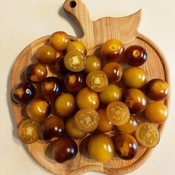 Экзотический, среднеспелый, высокорослый, урожайный сорт томатов черри для теплиц и открытого грунта. Куст мощный, индетерминантного типа, высотой до 1, 8 метра. Требуется подвязка к опоре и пасынкова... Показать описаниение. Наилучшие результаты получились при формировании растения в 2 стебля. Плоды округлые, гладкие, в стадии технической спелости фиолетовые, в биологической — желто-оранжевые с фиолетовым напылением. Средний вес 20-25 грамм. Вкус помидорок сладкий, с очень приятным насыщенным томатным ароматом. Сорт обладает продолжительным плодоношением, вяжет плоды до заморозков. К тому же устойчив к основным болезням томатов. Прекрасно подходит для цельноплодного консервирования.
