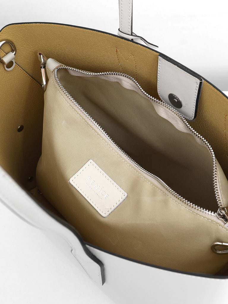 Шоппер от BE NICE из полужесткой натуральной кожи белого цвета Материал: натуральная кожа ? Размеры: Длина по дну: 34 см Длина по верхнему краю: 40 см Ширина по дну: 13,5 см Высота: 28 см Высота с руч... Показать описаниеками: 48 см Описание: Классическая сумка от итальянского бренда BE NICE выполнена из натуральной композиционной кожи, закрывается на магнит. Поместятся документы формата А4. Сумка носится на плече, на сгибе руки или в руке. Прилагается фирменный пыльник Внутри: Внутри съемная текстильная косметичка на молнии (32 см - длина, 24 см - высота) Производитель: BE NICE, Италия